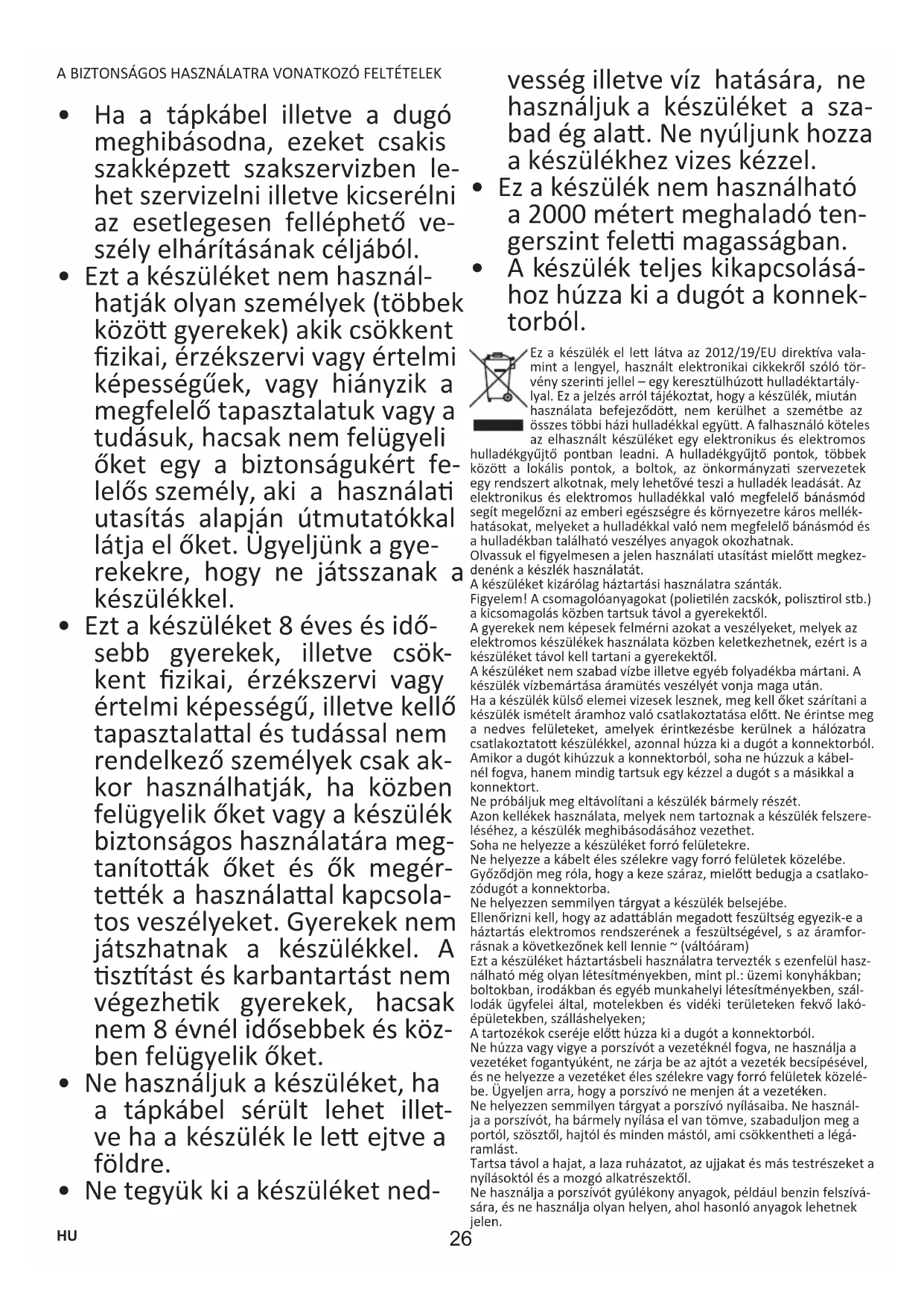 - A készülék teljes kikapcsolásá- hoz húzza ki a dugót a konnek- torból. Ez a készülék el le látva az 2012/19/EU direkva vala- mint a lengyel, használt elektronikai cikkekről szóló tör- vény szerin jellel – egy keresztülhúzo hulladéktartály- lyal. Ez a jelzés arról tájékoztat, hogy a készülék, miután használata befejeződö, nem kerülhet a szemétbe az összes többi házi hulladékkal együ. A falhasználó köteles az elhasznált készüléket egy elektronikus és elektromos hulladékgyűjtő pontban leadni. A hulladékgyűjtő pontok, többek közö a lokális pontok, a boltok, az önkormányza szervezetek egy rendszert alkotnak, mely lehetővé teszi a hulladék leadását. Az elektronikus és elektromos hulladékkal való megfelelő bánásmód segít megelőzni az emberi egészségre és környezetre káros mellék- hatásokat, melyeket a hulladékkal való nem megfelelő bánásmód és a hulladékban található veszélyes anyagok okozhatnak. Olvassuk el gyelmesen a jelen használa utasítást mielő megkez- denénk a készlék használatát. A készüléket kizárólag háztartási használatra szánták. Figyelem! A csomagolóanyagokat (polielén zacskók, poliszrol stb.) a kicsomagolás közben tartsuk távol a gyerekektől. A gyerekek nem képesek felmérni azokat a veszélyeket, melyek az elektromos készülékek használata közben keletkezhetnek, ezért is a készüléket távol kell tartani a gyerekektől. A készüléket nem szabad vízbe illetve egyéb folyadékba mártani. A készülék vízbemártása áramütés veszélyét vonja maga után. Ha a készülék külső elemei vizesek lesznek, meg kell őket szárítani a készülék ismételt áramhoz való csatlakoztatása elő. Ne érintse meg a nedves felületeket, amelyek érintkezésbe kerülnek a hálózatra csatlakoztato készülékkel, azonnal húzza ki a dugót a konnektorból. Amikor a dugót kihúzzuk a konnektorból, soha ne húzzuk a kábel- nél fogva, hanem mindig tartsuk egy kézzel a dugót s a másikkal a konnektort. Ne próbáljuk meg eltávolítani a készülék bármely részét. Azon kellékek használata, melyek nem tartoznak a készülék felszere- léséhez, a készülék meghibásodásához vezethet. Soha ne helyezze a készüléket forró felületekre. Ne helyezze a kábelt éles szélekre vagy forró felületek közelébe. Győződjön meg róla, hogy a keze száraz, mielő bedugja a csatlako- zódugót a konnektorba. Ne helyezzen semmilyen tárgyat a készülék belsejébe. Ellenőrizni kell, hogy az adaáblán megado feszültség egyezike a háztartás elektromos rendszerének a feszültségével, s az áramfor- rásnak a következőnek kell lennie ~ (váltóáram) Ezt a készüléket háztartásbeli használatra tervezték s ezenfelül hasz- nálható még olyan létesítményekben, mint pl.: üzemi konyhákban; boltokban, irodákban és egyéb munkahelyi létesítményekben, szál- lodák ügyfelei által, motelekben és vidéki területeken fekvő lakó- épületekben, szálláshelyeken; A tartozékok cseréje elő húzza ki a dugót a konnektorból. Ne húzza vagy vigye a porszívót a vezetéknél fogva, ne használja a vezetéket fogantyúként, ne zárja be az ajtót a vezeték becsípésével, és ne helyezze a vezetéket éles szélekre vagy forró felületek közelé- be. Ügyeljen arra, hogy a porszívó ne menjen át a vezetéken. Ne helyezzen semmilyen tárgyat a porszívó nyílásaiba. Ne használ- ja a porszívót, ha bármely nyílása el van tömve, szabaduljon meg a portól, szösztől, hajtól és minden mástól, ami csökkenthe a légá- ramlást. Tartsa távol a hajat, a laza ruházatot, az ujjakat és más testrészeket a nyílásoktól és a mozgó alkatrészektől. Ne használja a porszívót gyúlékony anyagok, például benzin felszívá- sára, és ne használja olyan helyen, ahol hasonló anyagok lehetnek jelen. HU27