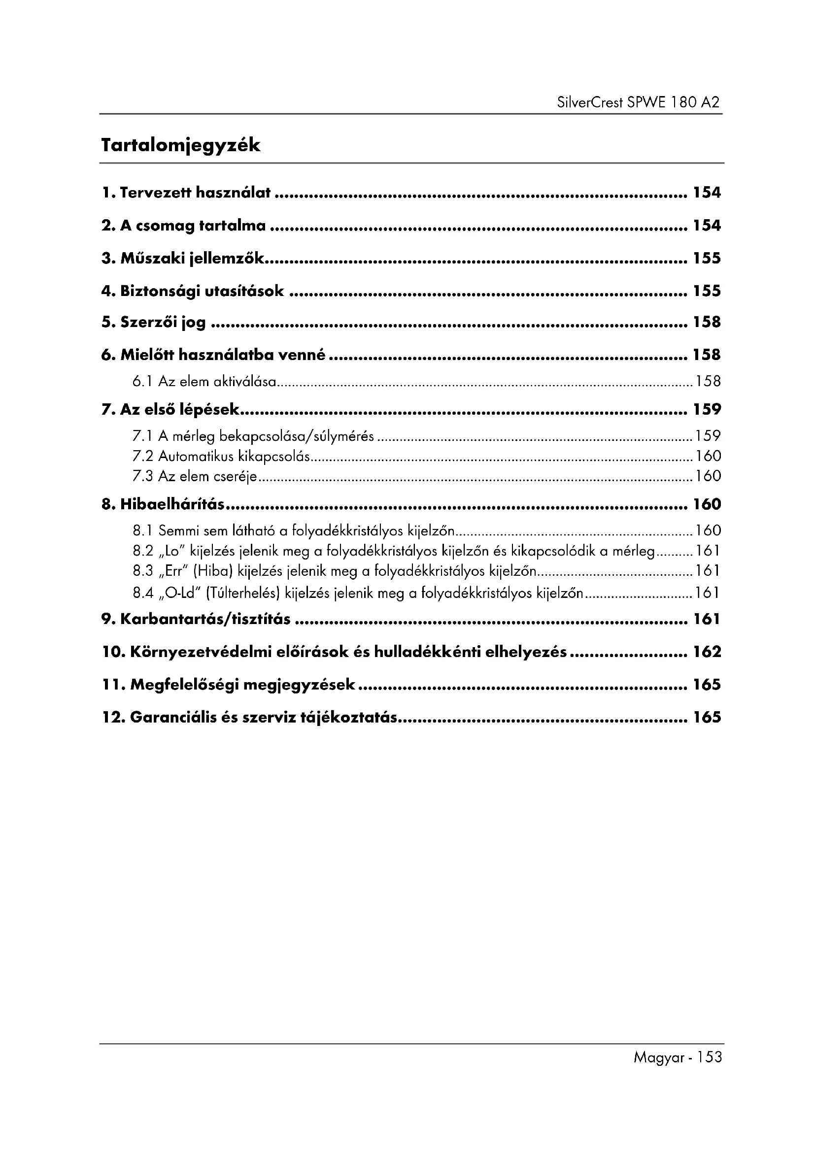 12. Garanciális és szerviz tájékoztatás ........................................................... 165SilverCrest SPWE 180 A2
