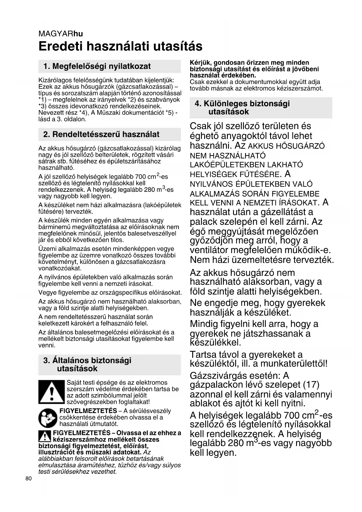 Eredeti használati utasítás Kizárólagos felelősségünk tudatában kijelentjük: Ezek az akkus hősugárzók (gázcsatlakozással) – típus és sorozatszám alapján történő azonosítással *1) – megfelelnek az irányelvek *2) és szabványok *3) összes idevonatkozó rendelkezéseinek. Nevezett rész *4), A Műszaki dokumentációt *5) - lásd a 3. oldalon. Az akkus hősugárzó (gázcsatlakozással) kizárólag nagy és jól szellőző belterületek, rögzített vásári sátrak stb. fűtéséhez és épületszárításához használható. A jól szellőző helyiségek legalább 700 cm
