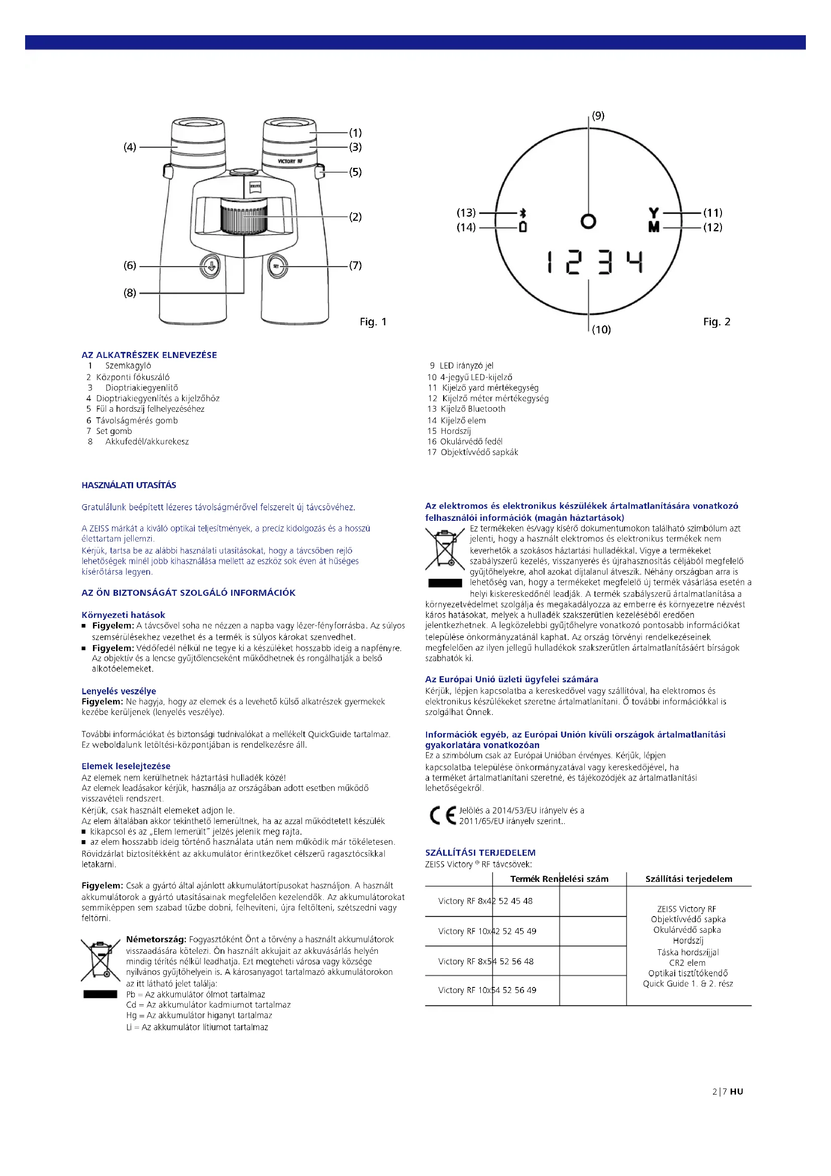 1 Szemkagyló 2 Központi fókuszáló 3 Dioptriakiegyenlítő 4 Dioptriakiegyenlítés a kijelzőhöz 5 Fül a hordszíj felhelyezéséhez 6 Távolságmérés gomb 7 Set gomb 8 Akkufedél/akkurekesz Az elektromos és elektronikus készülékek ártalmatlanítására vonatkozó felhasználói információk (magán háztartások) Ez termékeken és/vagy kísérő dokumentumokon található szimbólum azt jelenti, hogy a használt elektromos és elektronikus termékek nem keverhetők a szokásos háztartási hulladékkal. Vigye a termékeket szabályszerű kezelés, visszanyerés és újrahasznosítás céljából megfelelő gyűjtőhelyekre, ahol azokat díjtalanul átveszik. Néhány országban arra is lehetőség van, hogy a termékeket megfelelő új termék vásárlása esetén a helyi kiskereskedőnél leadják. A termék szabályszerű ártalmatlanítása a környezetvédelmet szolgálja és megakadályozza az emberre és környezetre nézvést káros hatásokat, melyek a hulladék szakszerűtlen kezeléséből eredően jelentkezhetnek. A legközelebbi gyűjtőhelyre vonatkozó pontosabb információkat települése önkormányzatánál kaphat. Az ország törvényi rendelkezéseinek megfelelően az ilyen jellegű hulladékok szakszerűtlen ártalmatlanításáért bírságok szabhatók ki. Az Európai Unió üzleti ügyfelei számára Kérjük, lépjen kapcsolatba a kereskedővel vagy szállítóval, ha elektromos és elektronikus készülékeket szeretne ártalmatlanítani. Ő további információkkal is szolgálhat Önnek. Információk egyéb, az Európai Unión kívüli országok ártalmatlanítási gyakorlatára vonatkozóan Ez a szimbólum csak az Európai Unióban érvényes. Kérjük, lépjen kapcsolatba települése önkormányzatával vagy kereskedőjével, ha a terméket ártalmatlanítani szeretné, és tájékozódjék az ártalmatlanítási lehetőségekről. Jelölés a 2014/53/EU irányelv és a 2011/65/EU irányelv szerint..