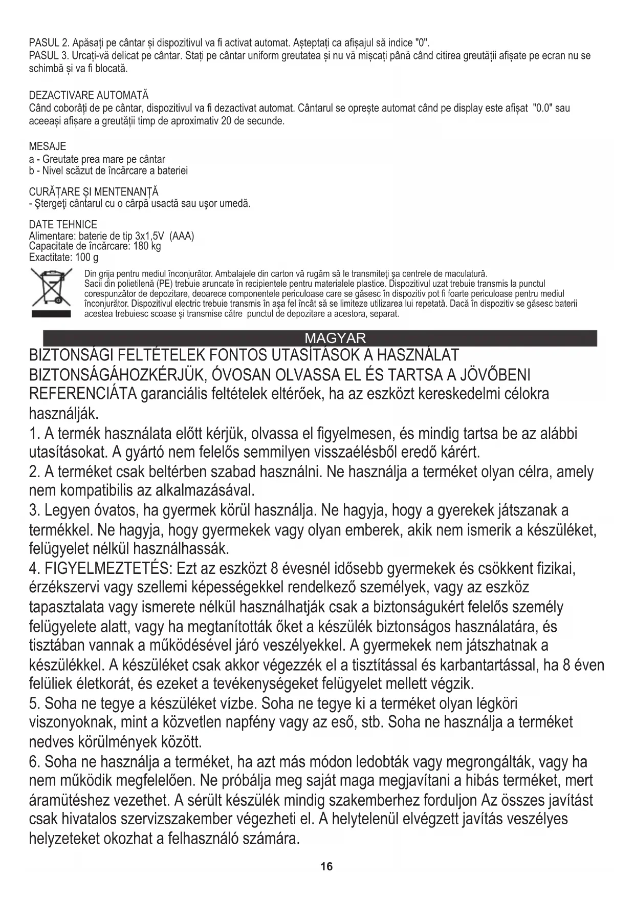 Teherbírás: 180 kg Táplálás: az elem típusa 3x1,5V (AAA) Pontosság: 100 g A környezet védelme érdekében kérjük külön karton dobozok és műanyag zsákokat és dobja őket a megfelelő hulladék közé. Használt készüléket kell eljuttatni a kijelölt gyűjtőhelyekre miatt veszélyes elemek alkatrészeket, amelyek hatással lehetnek a környezetre. Ne dobja a készüléket a közös szemétkosárba.18