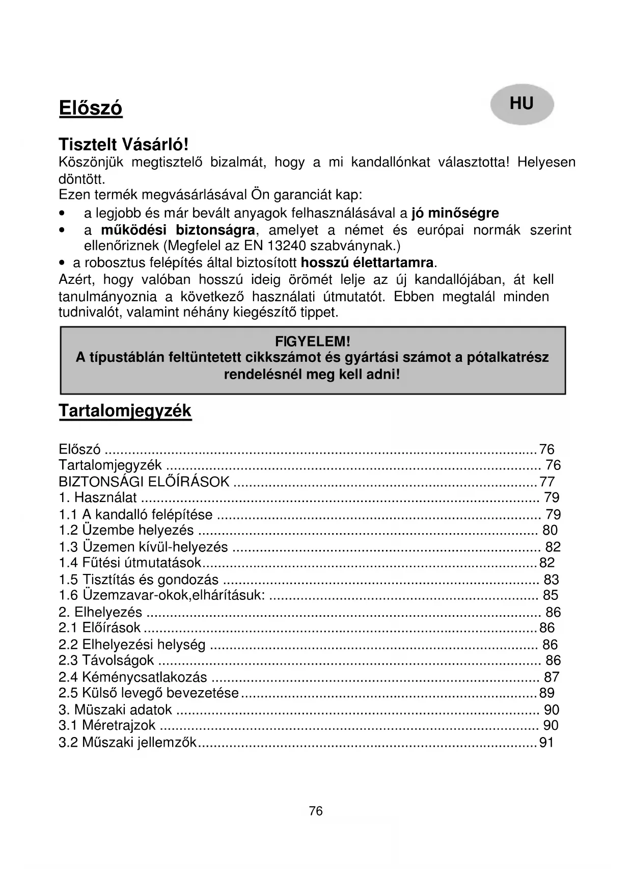 A típustáblán feltüntetett cikkszámot és gyártási számot a pótalkatrész rendelésnél meg kell adni!77