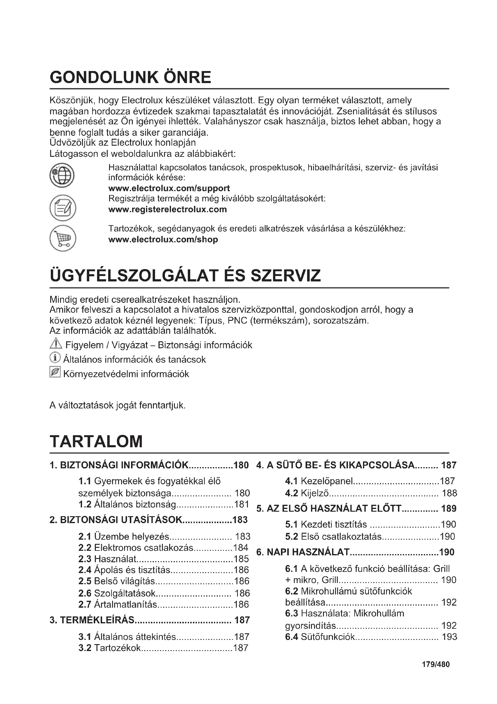 Köszönjük, hogy Electrolux készüléket választott. Egy olyan terméket választott, amely magában hordozza évtizedek szakmai tapasztalatát és innovációját. Zsenialitását és stílusos megjelenését az Ön igényei ihlették. Valahányszor csak használja, biztos lehet abban, hogy a benne foglalt tudás a siker garanciája. Üdvözöljük az Electrolux honlapján Látogasson el weboldalunkra az alábbiakért: Használattal kapcsolatos tanácsok, prospektusok, hibaelhárítási, szerviz- és javítási információk kérése: www.electrolux.com/support Regisztrálja termékét a még kiválóbb szolgáltatásokért: www.registerelectrolux.com Tartozékok, segédanyagok és eredeti alkatrészek vásárlása a készülékhez: www.electrolux.com/shop