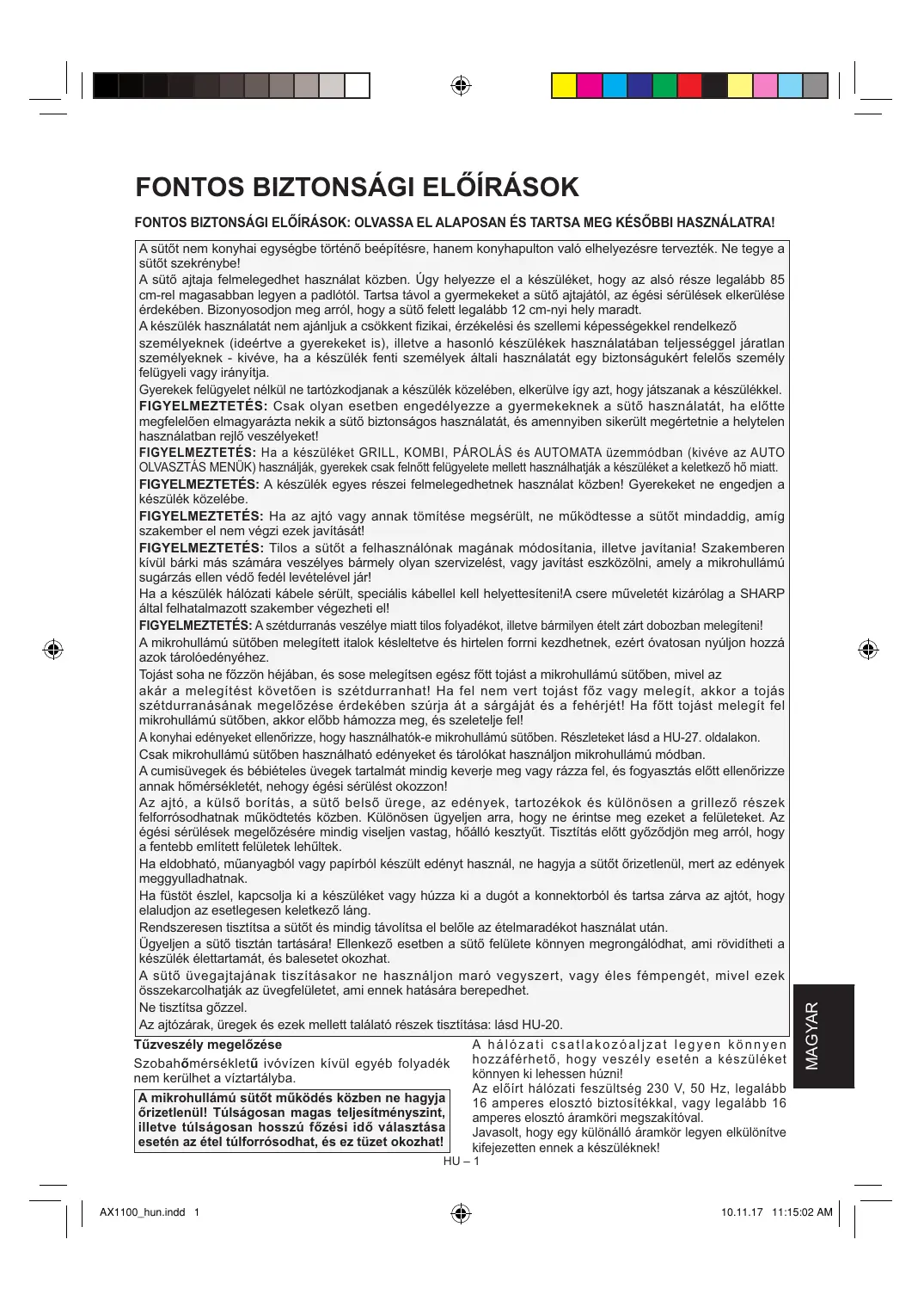 A sütőt nem konyhai egységbe történő beépítésre, hanem konyhapulton való elhelyezésre tervezték. Ne tegye a sütőt szekrénybe! A sütő ajtaja felmelegedhet használat közben. Úgy helyezze el a készüléket, hogy az alsó része legalább 85 cm-rel magasabban legyen a padlótól. Tartsa távol a gyermekeket a sütő ajtajától, az égési sérülések elkerülése érdekében. Bizonyosodjon meg arról, hogy a sütő felett legalább 12 cm-nyi hely maradt. A készülék használatát nem ajánljuk a csökkent fizikai, érzékelési és szellemi képességekkel rendelkező személyeknek (ideértve a gyerekeket is), illetve a hasonló készülékek használatában teljességgel járatlan személyeknek - kivéve, ha a készülék fenti személyek általi használatát egy biztonságukért felelős személy felügyeli vagy irányítja. Gyerekek felügyelet nélkül ne tartózkodjanak a készülék közelében, elkerülve így azt, hogy játszanak a készülékkel. FIGYELMEZTETÉS: Csak olyan esetben engedélyezze a gyermekeknek a sütő használatát, ha előtte megfelelően elmagyarázta nekik a sütő biztonságos használatát, és amennyiben sikerült megértetnie a helytelen használatban rejlő veszélyeket! FIGYELMEZTETÉS: Ha a készüléket GRILL, KOMBI, PÁROLÁS és AUTOMATA üzemmódban (kivéve az AUTO OLVASZTÁS MENÜK) használják, gyerekek csak felnőtt felügyelete mellett használhatják a készüléket a keletkező hő miatt. FIGYELMEZTETÉS: A készülék egyes részei felmelegedhetnek használat közben! Gyerekeket ne engedjen a készülék közelébe. FIGYELMEZTETÉS: Ha az ajtó vagy annak tömítése megsérült, ne működtesse a sütőt mindaddig, amíg szakember el nem végzi ezek javítását! FIGYELMEZTETÉS: Tilos a sütőt a felhasználónak magának módosítania, illetve javítania! Szakemberen kívül bárki más számára veszélyes bármely olyan szervizelést, vagy javítást eszközölni, amely a mikrohullámú sugárzás ellen védő fedél levételével jár! Ha a készülék hálózati kábele sérült, speciális kábellel kell helyettesíteni!A csere műveletét kizárólag a SHARP által felhatalmazott szakember végezheti el! FIGYELMEZTETÉS: A szétdurranás veszélye miatt tilos folyadékot, illetve bármilyen ételt zárt dobozban melegíteni! A mikrohullámú sütőben melegített italok késleltetve és hirtelen forrni kezdhetnek, ezért óvatosan nyúljon hozzá azok tárolóedényéhez. Tojást soha ne főzzön héjában, és sose melegítsen egész főtt tojást a mikrohullámú sütőben, mivel az akár a melegítést követően is szétdurranhat! Ha fel nem vert tojást főz vagy melegít, akkor a tojás szétdurranásának megelőzése érdekében szúrja át a sárgáját és a fehérjét! Ha főtt tojást melegít fel mikrohullámú sütőben, akkor előbb hámozza meg, és szeletelje fel! A konyhai edényeket ellenőrizze, hogy használhatók-e mikrohullámú sütőben. Részleteket lásd a HU-27. oldalakon. Csak mikrohullámú sütőben használható edényeket és tárolókat használjon mikrohullámú módban. A cumisüvegek és bébiételes üvegek tartalmát mindig keverje meg vagy rázza fel, és fogyasztás előtt ellenőrizze annak hőmérsékletét, nehogy égési sérülést okozzon! Az ajtó, a külső borítás, a sütő belső ürege, az edények, tartozékok és különösen a grillező részek felforrósodhatnak működtetés közben. Különösen ügyeljen arra, hogy ne érintse meg ezeket a felületeket. Az égési sérülések megelőzésére mindig viseljen vastag, hőálló kesztyűt. Tisztítás előtt győződjön meg arról, hogy a fentebb említett felületek lehűltek. Ha eldobható, műanyagból vagy papírból készült edényt használ, ne hagyja a sütőt őrizetlenül, mert az edények meggyulladhatnak. Ha füstöt észlel, kapcsolja ki a készüléket vagy húzza ki a dugót a konnektorból és tartsa zárva az ajtót, hogy elaludjon az esetlegesen keletkező láng. Rendszeresen tisztítsa a sütőt és mindig távolítsa el belőle az ételmaradékot használat után. Ügyeljen a sütő tisztán tartására! Ellenkező esetben a sütő felülete könnyen megrongálódhat, ami rövidítheti a készülék élettartamát, és balesetet okozhat. A sütő üvegajtajának tiszításakor ne használjon maró vegyszert, vagy éles fémpengét, mivel ezek összekarcolhatják az üvegfelületet, ami ennek hatására berepedhet. Ne tisztítsa gőzzel. Az ajtózárak, üregek és ezek mellett találató részek tisztítása: lásd HU-20. Tűzveszély megelőzése Szobahőmérsékletű ivóvízen kívül egyéb folyadék nem kerülhet a víztartályba. A mikrohullámú sütőt működés közben ne hagyja őrizetlenül! Túlságosan magas teljesítményszint, illetve túlságosan hosszú főzési idő választása esetén az étel túlforrósodhat, és ez tüzet okozhat! A hálózati csatlakozóaljzat legyen könnyen hozzáférhető, hogy veszély esetén a készüléket könnyen ki lehessen húzni! Az előírt hálózati feszültség 230 V, 50 Hz, legalább 16 amperes elosztó biztosítékkal, vagy legalább 16 amperes elosztó áramköri megszakítóval. Javasolt, hogy egy különálló áramkör legyen elkülönítve kifejezetten ennek a készüléknek! MAGYAR FONTOS BIZTONSÁGI ELŐÍRÁSOK: OLVASSA EL ALAPOSAN ÉS TARTSA MEG KÉSŐBBI HASZNÁLATRA! HU – 1 AX1100̲hun.indd 1