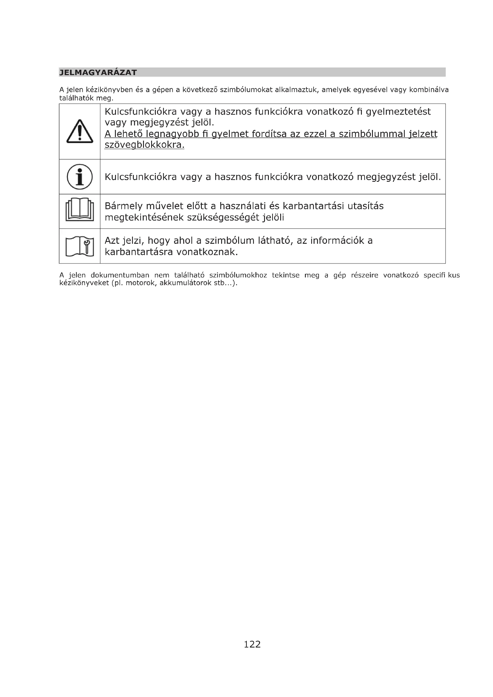 FEJEZET 19 – GARANCIA .........................................................139122 JELMAGYARÁZAT A jelen kézikönyvben és a gépen a következő szimbólumokat alkalmaztuk, amelyek egyesével vagy kombinálva találhatók meg. Kulcsfunkciókra vagy a hasznos funkciókra vonatkozó gyelmeztetést vagy megjegyzést jelöl. A lehető legnagyobb gyelmet fordítsa az ezzel a szimbólummal jelzett szövegblokkokra. Kulcsfunkciókra vagy a hasznos funkciókra vonatkozó megjegyzést jelöl. Bármely művelet előtt a használati és karbantartási utasítás megtekintésének szükségességét jelöli Azt jelzi, hogy ahol a szimbólum látható, az információk a karbantartásra vonatkoznak. A jelen dokumentumban nem található szimbólumokhoz tekintse meg a gép részeire vonatkozó speci kus kézikönyveket (pl. motorok, akkumulátorok stb...).123