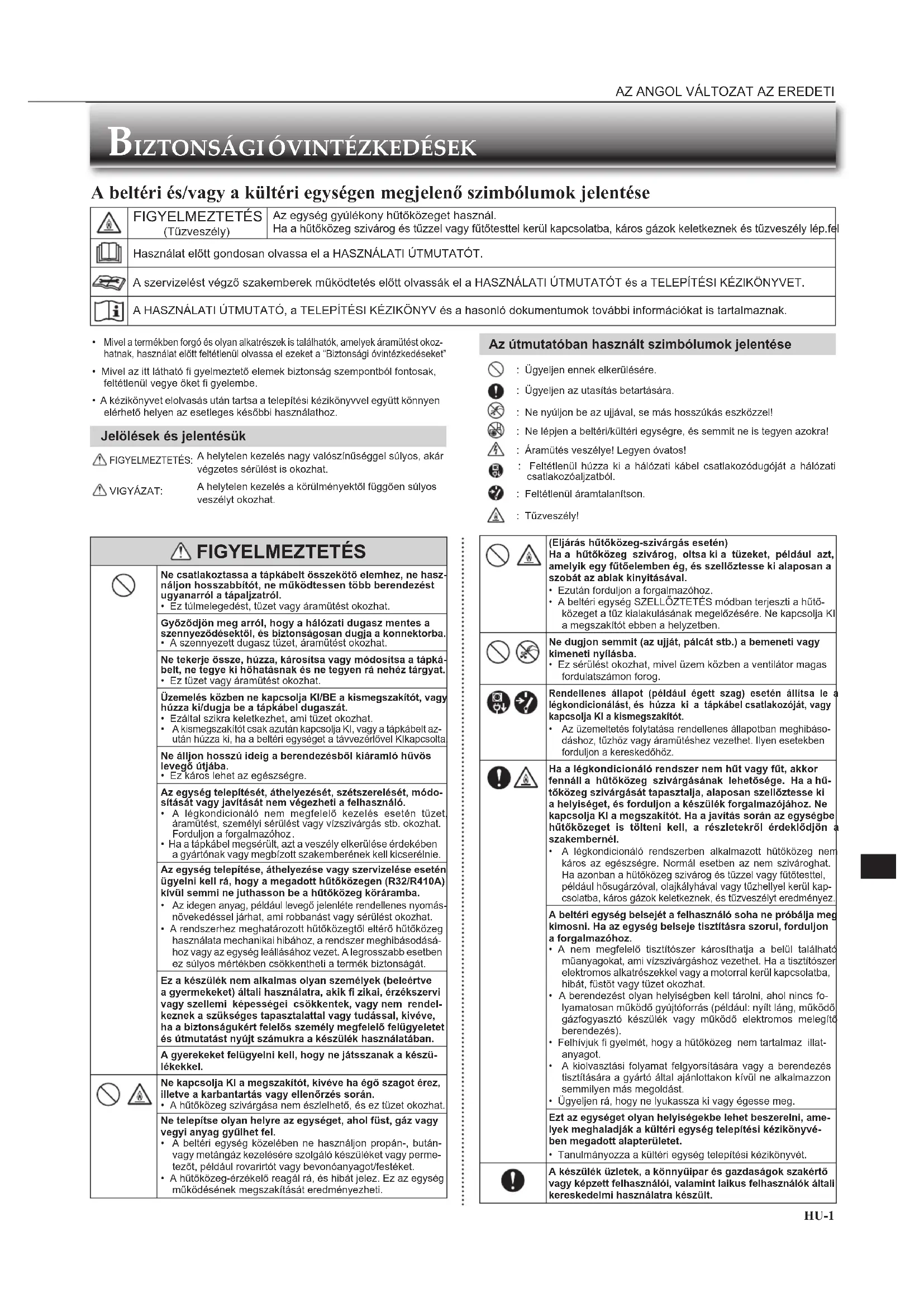 | Ne capcsolja KI a megszakitós, kîvee ha égo szagot érez, illette vǎkartartás vagy Ellenörzs során. • A hútközeg szivargása nem eszilehétó, és ez tüzel okozhat. | |