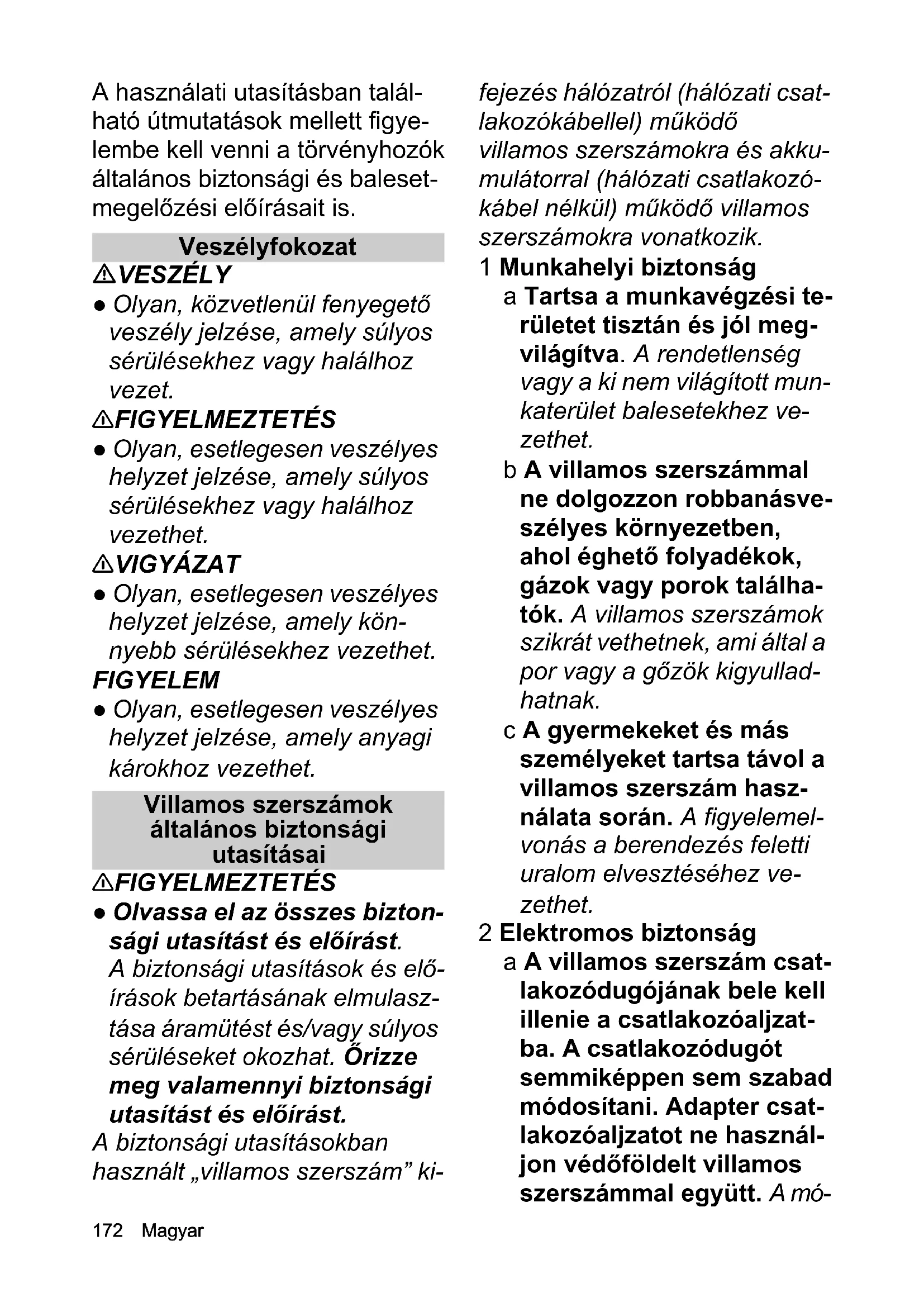 - EU-megfelelőségi nyilatkozat Chairman of the Board of ManagementDirector Regulatory Affairs & Certification H. Jenner S. Reiser172 Magyar A használati utasításban talál- ható útmutatások mellett figye- lembe kell venni a törvényhozók általános biztonsági és baleset- megelőzési előírásait is. Veszélyfokozat VESZÉLY ● Olyan, közvetlenül fenyegető veszély jelzése, amely súlyos sérülésekhez vagy halálhoz vezet. 몇 FIGYELMEZTETÉS ● Olyan, esetlegesen veszélyes helyzet jelzése, amely súlyos sérülésekhez vagy halálhoz vezethet. 몇 VIGYÁZAT ● Olyan, esetlegesen veszélyes helyzet jelzése, amely kön- nyebb sérülésekhez vezethet. FIGYELEM ● Olyan, esetlegesen veszélyes helyzet jelzése, amely anyagi károkhoz vezethet. Villamos szerszámok általános biztonsági utasításai 몇 FIGYELMEZTETÉS ● Olvassa el az összes bizton- sági utasítást és előírást. A biztonsági utasítások és elő- írások betartásának elmulasz- tása áramütést és/vagy súlyos sérüléseket okozhat. Őrizze meg valamennyi biztonsági utasítást és előírást. A biztonsági utasításokban használt „villamos szerszám” ki- fejezés hálózatról (hálózati csat- lakozókábellel) működő villamos szerszámokra és akku- mulátorral (hálózati csatlakozó- kábel nélkül) működő villamos szerszámokra vonatkozik. 1 Munkahelyi biztonság a Tartsa a munkavégzési te- rületet tisztán és jól meg- világítva. A rendetlenség vagy a ki nem világított mun- katerület balesetekhez ve- zethet. b A villamos szerszámmal ne dolgozzon robbanásve- szélyes környezetben, ahol éghető folyadékok, gázok vagy porok találha- tók. A villamos szerszámok szikrát vethetnek, ami által a por vagy a gőzök kigyullad- hatnak. c A gyermekeket és más személyeket tartsa távol a villamos szerszám hasz- nálata során. A figyelemel- vonás a berendezés feletti uralom elvesztéséhez ve- zethet. 2 Elektromos biztonság a A villamos szerszám csat- lakozódugójának bele kell illenie a csatlakozóaljzat- ba. A csatlakozódugót semmiképpen sem szabad módosítani. Adapter csat- lakozóaljzatot ne használ- jon védőföldelt villamos szerszámmal együtt. A mó-Magyar 173 dosítatlan csatlakozódugók és az ahhoz illő csatlakozó- aljzatok csökkentik az ára- mütés kockázatát. b Kerülje el a csövek, fűtő- testek, tűzhelyek és hű- tőszekrények földelt felületével való érintke- zést. Ezek ugyanis fokozott áramütési kockázatot jelen- tenek, ha az Ön teste földel- ve van. c A villamos szerszámokat tartsa távol az esőtől és a nedvességtől. A víz beha- tolása a villamos szerszá- mokba növeli az áramütés kockázatát. d A kábelt ne használja a rendeltetésén kívül más célra, például a villamos szerszám tartására, fela- kasztására, illetve a csat- lakozódugónak az aljzatból való kihúzására. Tartsa távol a kábelt hőtől, olajtól, éles szélektől vagy mozgó berendezéskom- ponensektől. A károsodott vagy megcsavarodott csat- lakozókábelek fokozzák az áramütés kockázatát. e Ha villamos szerszámmal dolgozik a szabadban, ak- kor csak olyan hosszabbí- tó kábelt használjon, amely a kültérben is hasz- nálható. A kültérben való használatra alkalmas hos- szabbító kábel alkalmazása csökkenti az áramütés koc- kázatát. f Ha a villamos szerszám használata nedves kör- nyezetben nem kerülhető el, akkor használjon hibaá- ram-védőkapcsolót. Hiba- áram-védőkapcsoló használata csökkenti az ára- mütés kockázatát. 3 Személyek biztonsága a Figyeljen oda és megfon- toltan végezze a villamos szerszámmal való munkát. Ha fáradt vagy kábítószer, alkohol vagy gyógyszer hatása alatt áll, akkor ne használja a villamos szer- számot. A villamos szer- szám használata során akár a pillanatnyi figyelmetlenség is komoly sérülésekhez ve- zethet. b Viseljen védőfelszerelést és minden esetben védő- szemüveget. A személyes védőfelszerelés (pl. porvédő maszk, csúszásmentes biz- tonsági kesztyű, védősisak vagy fülvédő) viselete a villa- mos szerszám használati módjától függően csökkenti a sérülések kockázatát. c Akadályozza meg a vélet- lenszerű üzembe helye- zést. Győződjön meg arról, hogy a villamos szerszám ki van kapcsol-174 Magyar va, mielőtt az áramellátás- hoz és/vagy az akkumulátorhoz csatla- koztatja, felemeli vagy tart- ja. Ha a villamos szerszám szállítása során az ujját a kapcsolón tartja, illetve ha a berendezést bekapcsolt ál- lapotban csatlakoztatja az áramellátáshoz, az balese- tet okozhat. d A villamos szerszám be- kapcsolása előtt távolítsa el a beállító szerszámot vagy a csavaros csatlako- zást. A berendezés forgó komponenseiben hagyott szerszám vagy kulcs sérülé- seket okozhat. e Törekedjen a normál test- tartás megőrzésére. Álljon stabilan, és mindig tartsa meg egyensúlyát. Ezáltal a villamos szerszámot várat- lan helyzetekben is jobban uralma alatt tudja tartani. f Viseljen megfelelő ruháza- tot. Ne viseljen bő ruhát vagy ékszert. Tartsa távol a haját, ruházatát és kesz- tyűjét a mozgó komponen- sektől. A bő ruházat, a kesztyű, az ékszer vagy a hosszú haj becsípődhet a mozgó komponensek közé. g Porelszívó és -felfogó be- rendezések felszerelése esetén győződjön meg ar- ról, hogy ezek csatlakoz- tatva vannak és helyesen használják őket. A porelszí- vás alkalmazása csökkent- heti a por általi veszélyek kialakulását. 4 Villamos szerszám haszná- lata és kezelése a Ne terhelje túl a berende- zést. A munkavégzéshez a megfelelő villamos szer- számot használja. A meg- felelő villamos szerszámmal jobban és biztonságosab- ban tud dolgozni a megadott teljesítménytartományban. b Ne használjon olyan villa- mos szerszámot, amely- nek kapcsolója elromlott. Az olyan villamos szersz