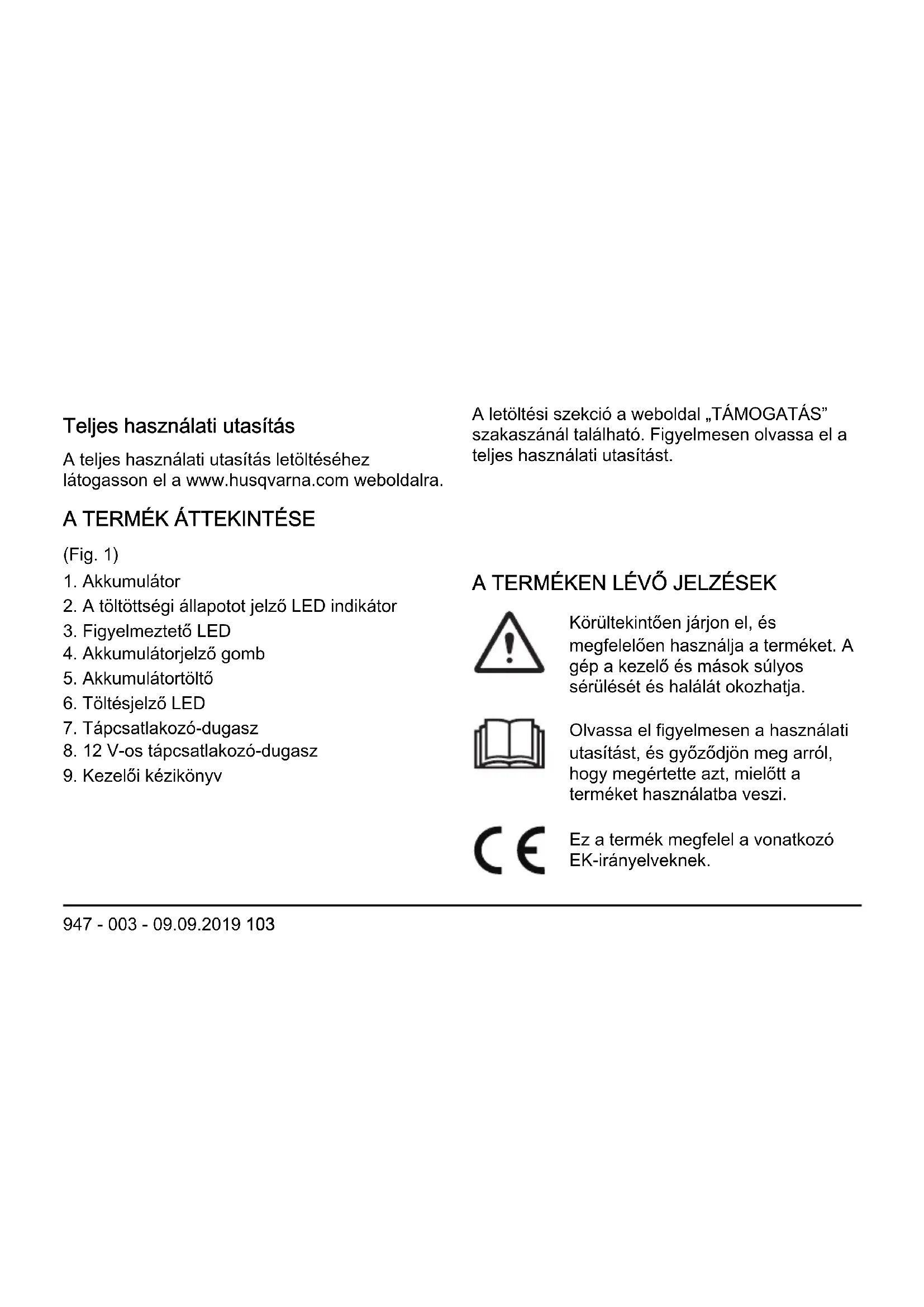 Tehničke podatke potražite na natpisnoj pločici punjača baterije. 102 947 - 003 - 09.09.2019Teljes használati utasítás A teljes használati utasítás letöltéséhez látogasson el a www.husqvarna.com weboldalra. A letöltési szekció a weboldal „TÁMOGATÁS” szakaszánál található. Figyelmesen olvassa el a teljes használati utasítást.