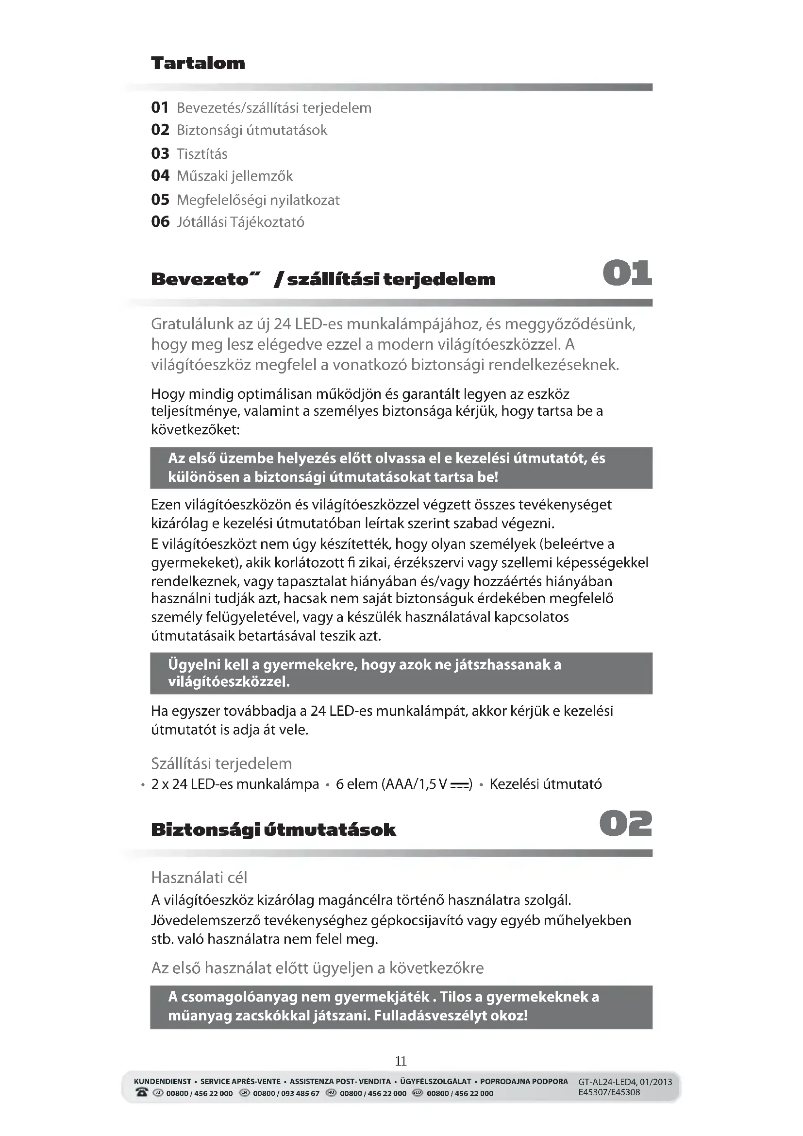 - 2 x 24 LED-es munkalámpa • 6 elem (AAA/1,5 V ) • Kezelési útmutató Tartalom Bevezeto˝ / szállítási terjedelem