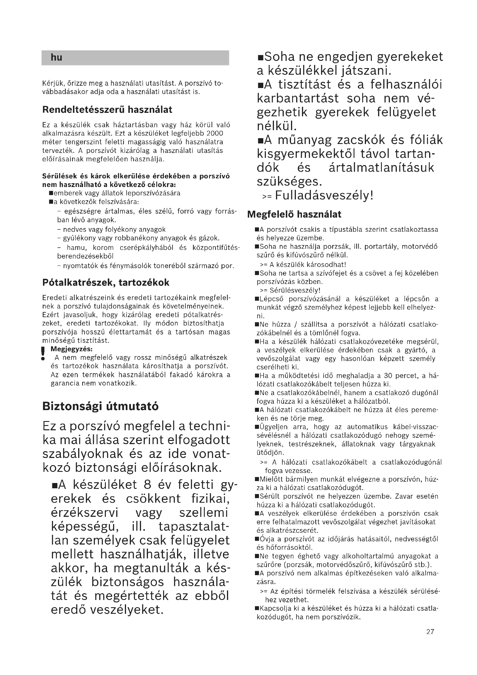 Soha ne engedjen gyerekeket a készülékkel játszani. A tisztítást és a felhasználói karbantartást soha nem vé- gezhetik gyerekek felügyelet nélkül. A műanyag zacskók és fóliák kisgyermekektől távol tartan- dók és ártalmatlanításuk szükséges. >= Fulladásveszély! Megfelelő használat A porszívót csakis a típustábla szerint csatlakoztassa és helyezze üzembe. Soha ne használja porzsák, ill. portartály, motorvédő szűrő és kifúvószűrő nélkül. >= A készülék károsodhat! Soha ne tartsa a szívófejet és a csövet a fej közelében porszívózás közben.>= Sérülésveszély! Lépcső porszívózásánál a készüléket a lépcsőn a munkát végző személyhez képest lejjebb kell elhelyez- ni. Ne húzza / szállítsa a porszívót a hálózati csatlako-zókábelnél és a tömlőnél fogva. Ha a készülék hálózati csatlakozóvezetéke megsérül, a veszélyek elkerülése érdekében csak a gyártó, a vevőszolgálat vagy egy hasonlóan képzett személy cserélheti ki. Ha a működtetési idő meghaladja a 30 percet, a há-lózati csatlakozókábelt teljesen húzza ki. Ne a csatlakozókábelnél, hanem a csatlakozó dugónál fogva húzza ki a készüléket a hálózatból. A hálózati csatlakozókábelt ne húzza át éles pereme-ken és ne törje meg. Ügyeljen arra, hogy az automatikus kábel-visszac-sévélésnél a hálózati csatlakozódugó nehogy szemé-lyeknek, testrészeknek, állatoknak vagy tárgyaknak ütődjön. >= A hálózati csatlakozókábelt a csatlakozódugónál fogva vezesse. Mielőtt bármilyen munkát elvégezne a porszívón, húz-za ki a hálózati csatlakozódugót. Sérült porszívót ne helyezzen üzembe. Zavar esetén húzza ki a hálózati csatlakozódugót. A veszélyek elkerülése érdekében a porszívón csak erre felhatalmazott vevőszolgálat végezhet javításokat és alkatrészcserét. Óvja a porszívót az időjárás hatásaitól, nedvességtől és hőforrásoktól. Ne tegyen éghető vagy alkoholtartalmú anyagokat a szűrőre (porzsák, motorvédőszűrő, kifúvószűrő stb.). A porszívó nem alkalmas építkezéseken való alkalma-zásra.>= Az építési törmelék felszívása a készülék sérülésé-hez vezethet. Kapcsolja ki a készüléket és húzza ki a hálózati csatla-kozódugót, ha nem porszívózik.28 A kiselejtezett készüléket azonnal tegye használhatat-lanná, ezután végezze el szakszerű ártalmatlanítását. Kérjük, vegye figyelembe az alábbiakat A hálózati csatlakozóaljzatot legalább 16 A-es bizto-sítéknak kell védenie. Ha a biztosíték a készülék bekapcsolásakor egyszer kioldana, annak az lehet az oka, hogy egyidejűleg más nagy áramfelvételű elektromos készülék is ug-yanarra az áramkörre lett csatlakoztatva. A biztosíték kioldása elkerülhető, ha a készüléket bekapcsolás előtt a legalacsonyabb teljesítményfo-kozatra állítja, majd működés közben kapcsolja fo-kozatosan magasabb teljesítményfokozatra. Környezetvédelmi tudnivalók Csomagolás A csomagolás védi a porszívót a szállítás során keletkező sérülésektől. A csomagolás környezet-barát anyagokból készült, és ezért újrafeldolgozásra alkalmas. A továbbiakban már nem szükséges cso-magolóanyagot helyezze el a szelektív gyűjtőhelyek megfelelő tárolóiban. Régi készülék A régi készülék még sok értékes anyagot tartalmaz. Ezért kiselejtezett készülékét adja le újrahasznosí-tásra kereskedőjénél vagy egy MÉH-telepen. Az ak-tuális ártalmatlanítási lehetőségekről érdeklődjön kereskedőjénél vagy a helyi önkormányzatnál. A szűrőt dobja ki A szűrők olyan anyagokból készülnek, amelyek nem befolyásolják a környezetet. Ha nem tartalmaz olyan anyagot, amelyet nem szabad a háztartási hulladék-kal együtt ártalmatlanítani, a háztartási hulladékkal együtt ártalmatlaníthatja. Általános útmutatások Tartozékok A tartozék (szívófej, szívócső stb.) kinézete azonos működési mód esetén eltérhet a használati útmu-tatóban található ábráktól. Szimbólumok Kárpitozott bútorok, párnák és függönyök porszívózásához. Szőnyegek és szőnyegpadlók porszívózásához Kemény padlók porszívózásához Сохраните инструкцию по эксплуатации. При передаче пылесоса новому владельцу не забудьте передать также инструкцию по эксплуатации. Указания по использованию Этот прибор предназначен только для домашнего использования и в бытовых условиях. Данный прибор предназначен для использования на высоте не более 2000 м над уровнем моря.Во избежание травм и повреждений пылесос нельзя использовать для : чистки людей и животных; всасывания: − вредных для здоровья веществ, острых, горячих или раскалённых предметов; − мокрых предметов и жидкостей; − легковоспламеняющихся или взрывчатых веществ и газов; − пепла, сажи из кафельных печей и систем центрального отопления; − тонера из принтеров или копировальных аппаратов. Запасные части, принадлежности Наши оригинальные запчасти и аксессуары оптимально соответствуют характеристикам и требованиям наших пылесосов. Поэтому мы рекомендуем использовать только оригинальные зап