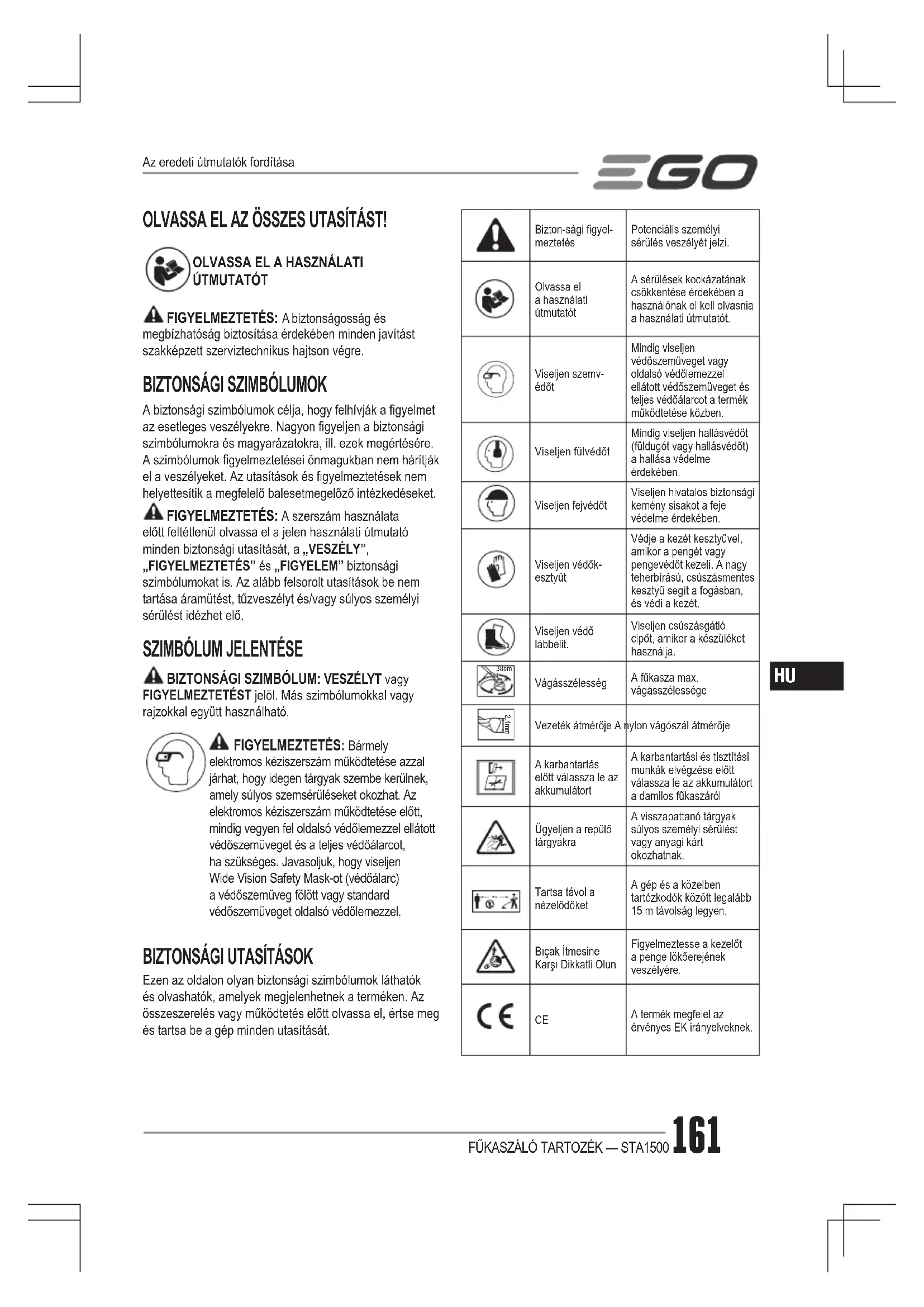 PROBLÉMA A PROBLÉMA OKA ŘEŠENÍ Fűkaszáló nem indul. ◾ Az akkumulátoregység nincs csatlakoztatva a meghajtófejhez. ◾ Csatlakoztassa az akkumulátoregységet a meghajtófejhez. ◾ Nincs elektromos kapcsolat a meghajtófej és az akkumulátoregység között. ◾ Vegye ki az akkumulátoregységet, ellenőrizze a csatlakozást, és helyezze vissza az akkumulátoregységet, amíg a helyén nincsen. ◾ Az akkumulátoregység lemerült. ◾ Töltse fel az akkumulátoregységet EGO a jelen útmutatóban megadott töltővel ◾ A kapcsoló gomb és a trigger nem egyidejűleg van megnyomva. ◾ Nyomja meg és tartsa lenyomva a kapcsoló gombot, majd oldja ki a triggert a fűkasza bekapcsolásához.A fűkasza vágás közben leáll. ◾ A védőburkolat nincs felszerelve a fűkaszára, amely révén a vágószál túl hosszú, és a motor túlterhelt. ◾ Vegye ki az akkumulátoregységet, és szerelje fel a védőburkolatot a fűkaszára. ◾ Használjon nagy teherbírású vágószálat. ◾ Használja a javasolt nylon vágószálat, legfeljebb 2,4 mm átmérővel. ◾ A motor tengely vagy fűkasza fej beakadt a fűbe. ◾ Állítsa le a fűkaszát, vegye ki az akkumulátort, és távolítsa el a füvet a motor tengelyről és fűkasza fejről. ◾ A motor túlterhelt ◾ Távolítsa el a füvet a fűkasza fejről. A motor újra működőképes, ha a terhet eltávolítja. Vágás közben a fűkasza fejet oda-vissza mozgassa a vágandó füvön, és 20 cm-nél hosszabb füvet ne vágjon egy vágással. ◾ Az akkumulátoregység vagy a fűkasza túl forró. ◾ Hűtse le az akkumulátoregységet vagy a fűkaszát 67 °C alatti hőmérsékletre. ◾ Az akkumulátoregység ki van véve a szerszámból. ◾ Helyezze vissza az akkumulátoregységet. ◾ Az akkumulátoregység lemerült. ◾ Töltse fel az akkumulátoregységet EGO a jelen útmutatóban megadott töltővelFŰKASZÁLÓ TARTOZÉK — STA1500 170