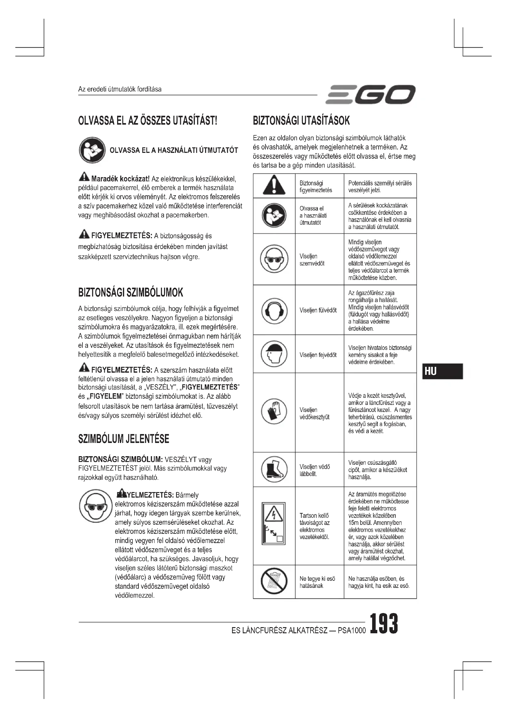 Ezen az oldalon olyan biztonsági szimbólumok láthatók és olvashatók, amelyek megjelenhetnek a terméken. Az összeszerelés vagy működtetés előtt olvassa el, értse meg és tartsa be a gép minden utasítását. Biztonsági gyelmeztetésPotenciális személyi sérülés veszélyét jelzi.Olvassa el a használati útmutatótA sérülések kockázatának csökkentése érdekében a használónak el kell olvasnia a használati útmutatót.Viseljen szemvédőtMindig viseljen védőszemüveget vagy oldalsó védőlemezzel ellátott védőszemüveget és teljes védőálarcot a termék működtetése közben.Viseljen fülvédőtAz ágazófűrész zaja rongálhatja a hallását. Mindig viseljen hallásvédőt (füldugót vagy hallásvédőt) a hallása védelme érdekében.Viseljen fejvédőtViseljen hivatalos biztonsági kemény sisakot a feje védelme érdekében.Viseljen védőkesztyűtVédje a kezét kesztyűvel, amikor a láncfűrészt vagy a fűrészláncot kezeli. A nagy teherbírású, csúszásmentes kesztyű segít a fogásban, és védi a kezét.Viseljen védő lábbelit.Viseljen csúszásgátló cipőt, amikor a készüléket használja.Tartson kellő távolságot az elektromos vezetékektől.Az áramütés megelőzése érdekében ne működtesse feje feletti elektromos vezetékek közelében 15m belül. Amennyiben elektromos vezetékekhez ér, vagy azok közelében használja, akkor sérülést vagy áramütést okozhat, amely halállal végződhet.Ne tegye ki eső hatásánakNe használja esőben, és hagyja kint, ha esik az eső. Az eredeti útmutatók fordításaES LÁNCFURÉSZ ALKATRÉSZ — PSA1000 194
