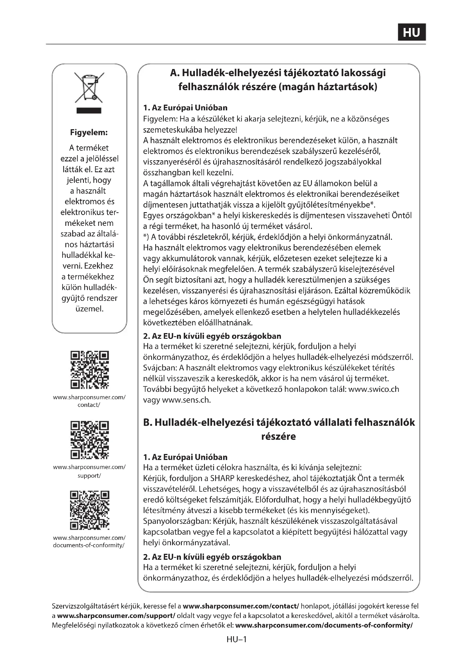 Ha a terméket ki szeretné selejtezni, kérjük, forduljon a helyi önkormányzathoz, és érdeklődjön a helyes hulladék-elhelyezési módszerről. Szervizszolgáltatásért kérjük, keresse fel a www.sharpconsumer.com/contact/ honlapot, jótállási jogokért keresse fel a www.sharpconsumer.com/support/ oldalt vagy vegye fel a kapcsolatot a kereskedővel, akitől a terméket vásárolta. Megfelelőségi nyilatkozatok a következő címen érhetők el: www.sharpconsumer.com/documents-of-conformity/ www.sharpconsumer.com/support/www.sharpconsumer.com/documents-of-conformity/www.sharpconsumer.com/contact/HU–2 HU–2 BIZTONSÁGI ÓVINTÉZKEDÉSEK A MIKROHULLÁMÚ SUGÁRZÁS