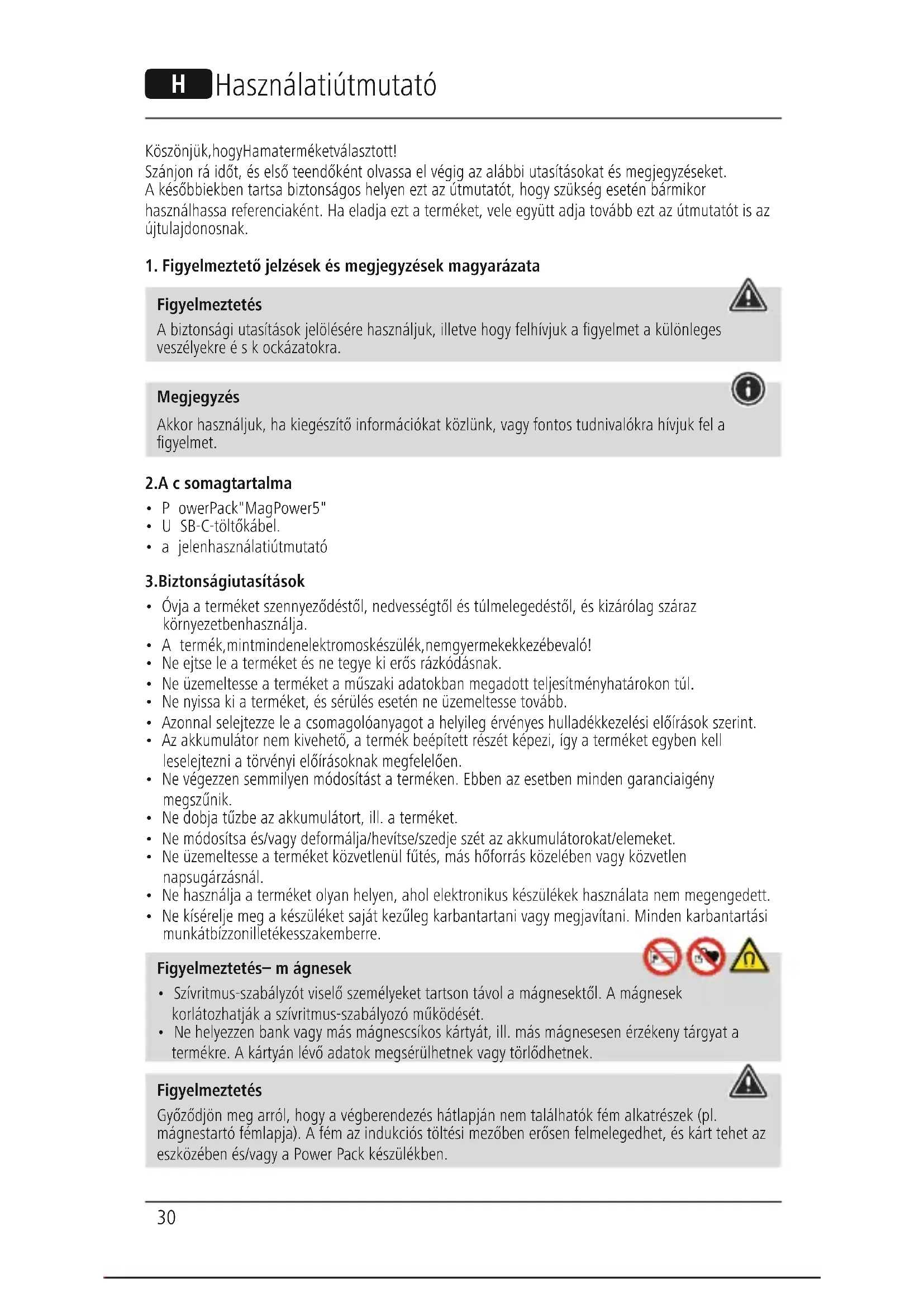 - Nehelyezzen bank vagy más mágnescsíkos kártyát, ill. más mágnesesen érzékenytárgyat a termékre. Akártyán lévő adatok megsérülhetnek vagy törlődhetnek. Figyelmeztetés Győződjön meg arról,hogy avégberendezés hátlapján nem találhatók fémalkatrészek (pl. mágnestartó fémlapja). Afém az indukciós töltési mezőben erősen felmelegedhet, és kárt tehet az eszközébenés/vagy aPower Pack készülékben. H Használati útmutató31