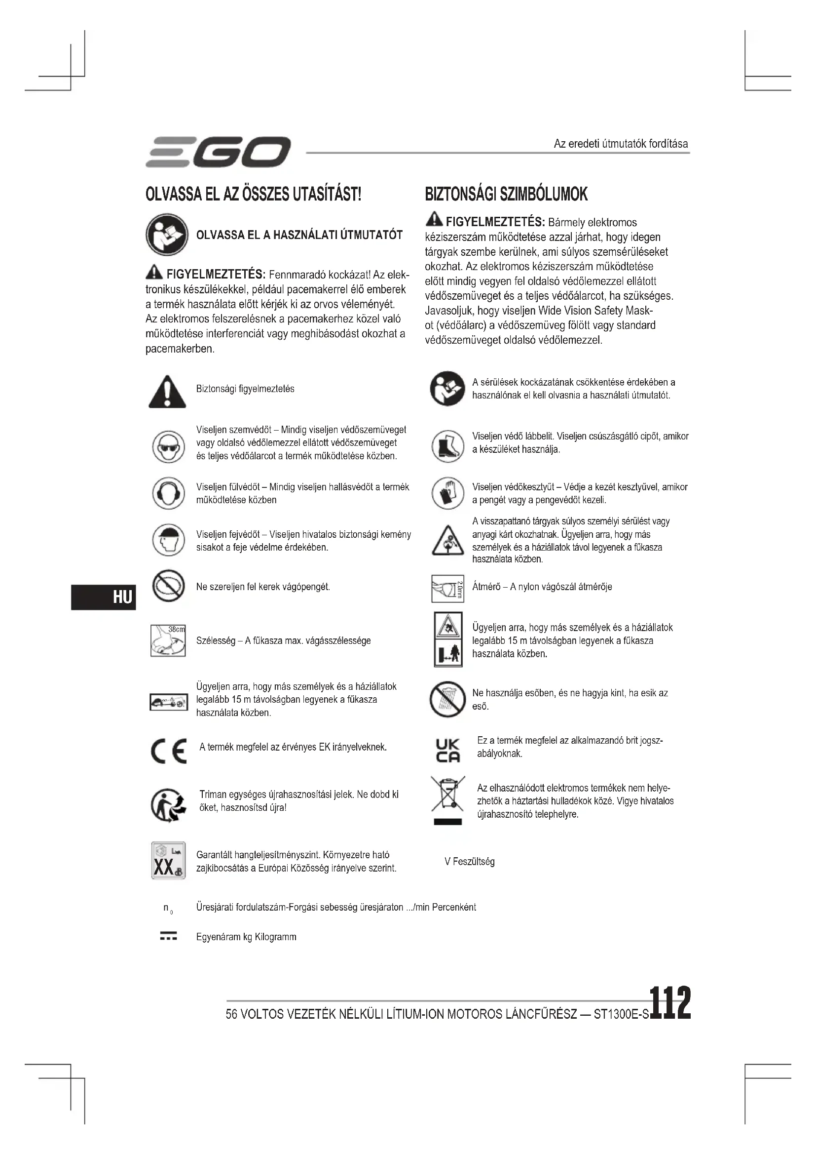 FIGYELMEZTETÉS: Bármely elektromos kéziszerszám működtetése azzal járhat, hogy idegen tárgyak szembe kerülnek, ami súlyos szemsérüléseket okozhat. Az elektromos kéziszerszám működtetése előtt mindig vegyen fel oldalsó védőlemezzel ellátott védőszemüveget és a teljes védőálarcot, ha szükséges. Javasoljuk, hogy viseljen Wide Vision Safety Mask-ot (védőálarc) a védőszemüveg fölött vagy standard védőszemüveget oldalsó védőlemezzel. Biztonsági gyelmeztetésA sérülések kockázatának csökkentése érdekében a használónak el kell olvasnia a használati útmutatót.Viseljen szemvédőt – Mindig viseljen védőszemüveget vagy oldalsó védőlemezzel ellátott védőszemüveget és teljes védőálarcot a termék működtetése közben.Viseljen védő lábbelit. Viseljen csúszásgátló cipőt, amikor a készüléket használja.Viseljen fülvédőt – Mindig viseljen hallásvédőt a termék működtetése közbenViseljen védőkesztyűt – Védje a kezét kesztyűvel, amikor a pengét vagy a pengevédőt kezeli.Viseljen fejvédőt – Viseljen hivatalos biztonsági kemény sisakot a feje védelme érdekében.A visszapattanó tárgyak súlyos személyi sérülést vagy anyagi kárt okozhatnak. Ügyeljen arra, hogy más személyek és a háziállatok távol legyenek a fűkasza használata közben.Ne szereljen fel kerek vágópengét. 2.0mmÁtmérő – A nylon vágószál átmérője 38cm Szélesség – A fűkasza max. vágásszélességeÜgyeljen arra, hogy más személyek és a háziállatok legalább 15 m távolságban legyenek a fűkasza használata közben. 15m Ügyeljen arra, hogy más személyek és a háziállatok legalább 15 m távolságban legyenek a fűkasza használata közben.Ne használja esőben, és ne hagyja kint, ha esik az eső. A termék megfelel az érvényes EK irányelveknek.Ez a termék megfelel az alkalmazandó brit jogsz-abályoknak.Triman egységes újrahasznosítási jelek. Ne dobd ki őket, hasznosítsd újra!Az elhasználódott elektromos termékek nem helye-zhetők a háztartási hulladékok közé. Vigye hivatalos újrahasznosító telephelyre.