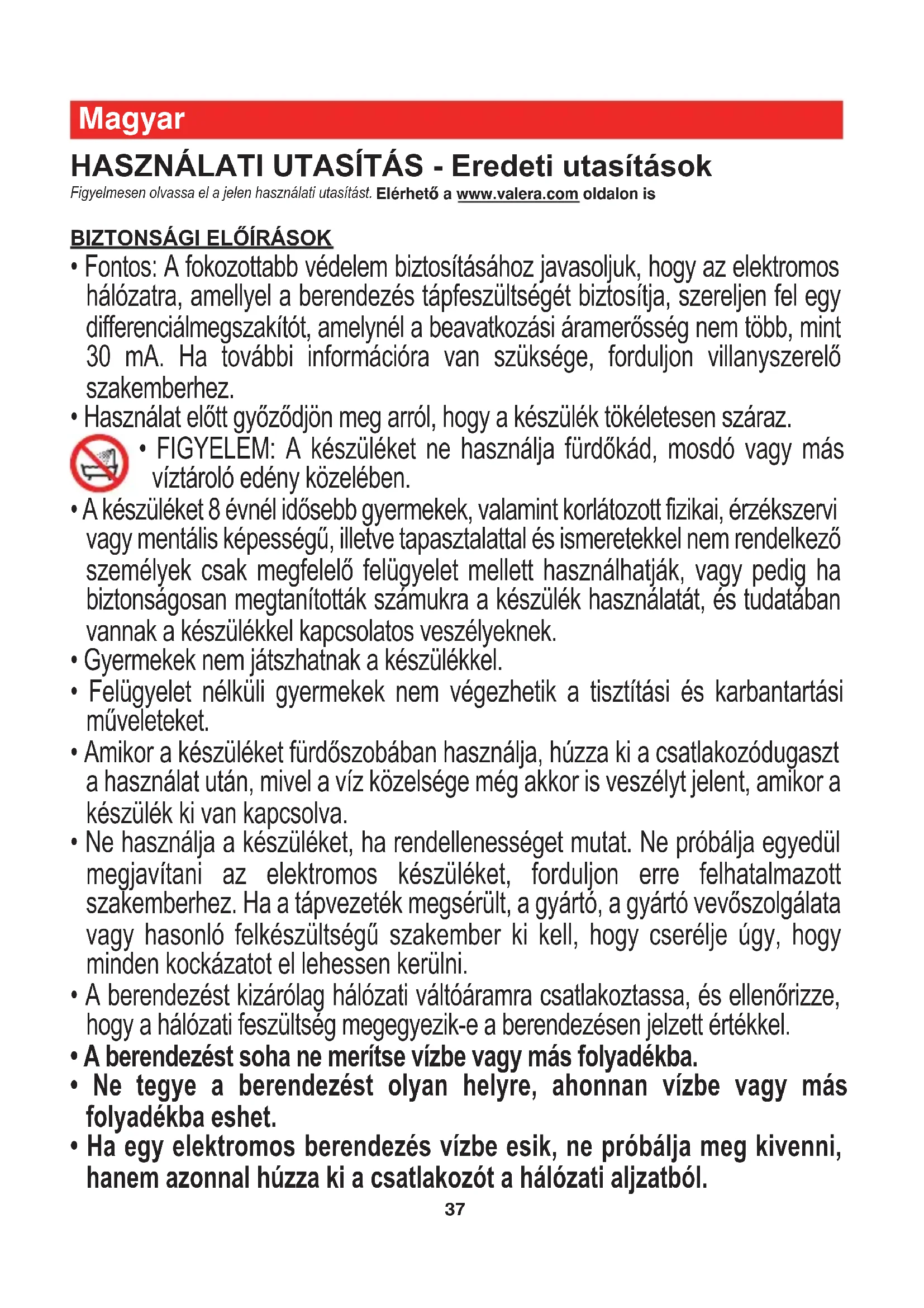 - FIGYELEM: A készüléket ne használja fürdőkád, mosdó vagy más víztároló edény közelében.