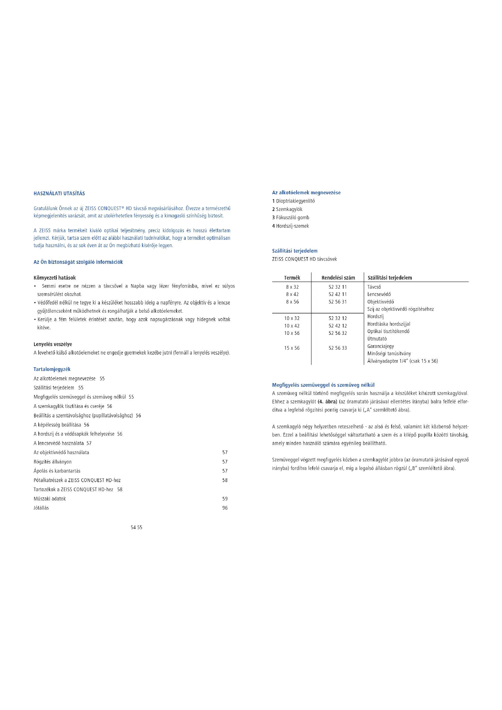 HD távcső megvásárlásához. Élvezze a természethű képmegjelenítés varázsát, amit az utolérhetetlen fényesség és a kimagasló színhűség biztosít. A ZEISS márka termékeit kiváló optikai teljesítmény, precíz kidolgozás és hosszú élettartam jellemzi. Kérjük, tartsa szem előtt az alábbi használati tudnivalókat, hogy a terméket optimálisan tudja használni, és az sok éven át az Ön megbízható kísérője legyen. Az Ön biztonságát szolgáló információk Környezeti hatások Semmi esetre ne nézzen a távcsővel a Napba vagy lézer fényforrásba, mivel ez súlyos szemsérülést okozhat. Védőfedél nélkül ne tegye ki a készüléket hosszabb ideig a napfényre. Az objektív és a lencse gyűjtőlencseként működhetnek és rongálhatják a belső alkotóelemeket. Kerülje a fém felületek érintését azután, hogy azok napsugárzásnak vagy hidegnek voltak kitéve. Lenyelés veszélye A levehető külső alkotóelemeket ne engedje gyermekek kezébe jutni (fennáll a lenyelés veszélye). Tartalomjegyzék Az alkotóelemek megnevezése 55 Szállítási terjedelem 55 Megfigyelés szemüveggel és szemüveg nélkül 55 A szemkagylók tisztítása és cseréje 56 Beállítás a szemtávolsághoz (pupillatávolsághoz) 56 A képélesség beállítása 56 A hordszíj és a védősapkák felhelyezése 56 A lencsevédő használata 57 Az objektívvédő használata 57 Rögzítés állványon 57 Ápolás és karbantartás 57 Pótalkatrészek a ZEISS CONQUEST HD-hez 58 Tartozékok a ZEISS CONQUEST HD-hez 58 Műszaki adatok 59 Jótállás 96 Az alkotóelemek megnevezése 1 Dioptriakiegyenlítő 2 Szemkagylók 3 Fókuszáló gomb 4 Hordszíj-szemek Szállítási terjedelem ZEISS CONQUEST HD távcsövek Termék Rendelési szám Szállítási terjedelem 8 x 32 8 x 42 8 x 56