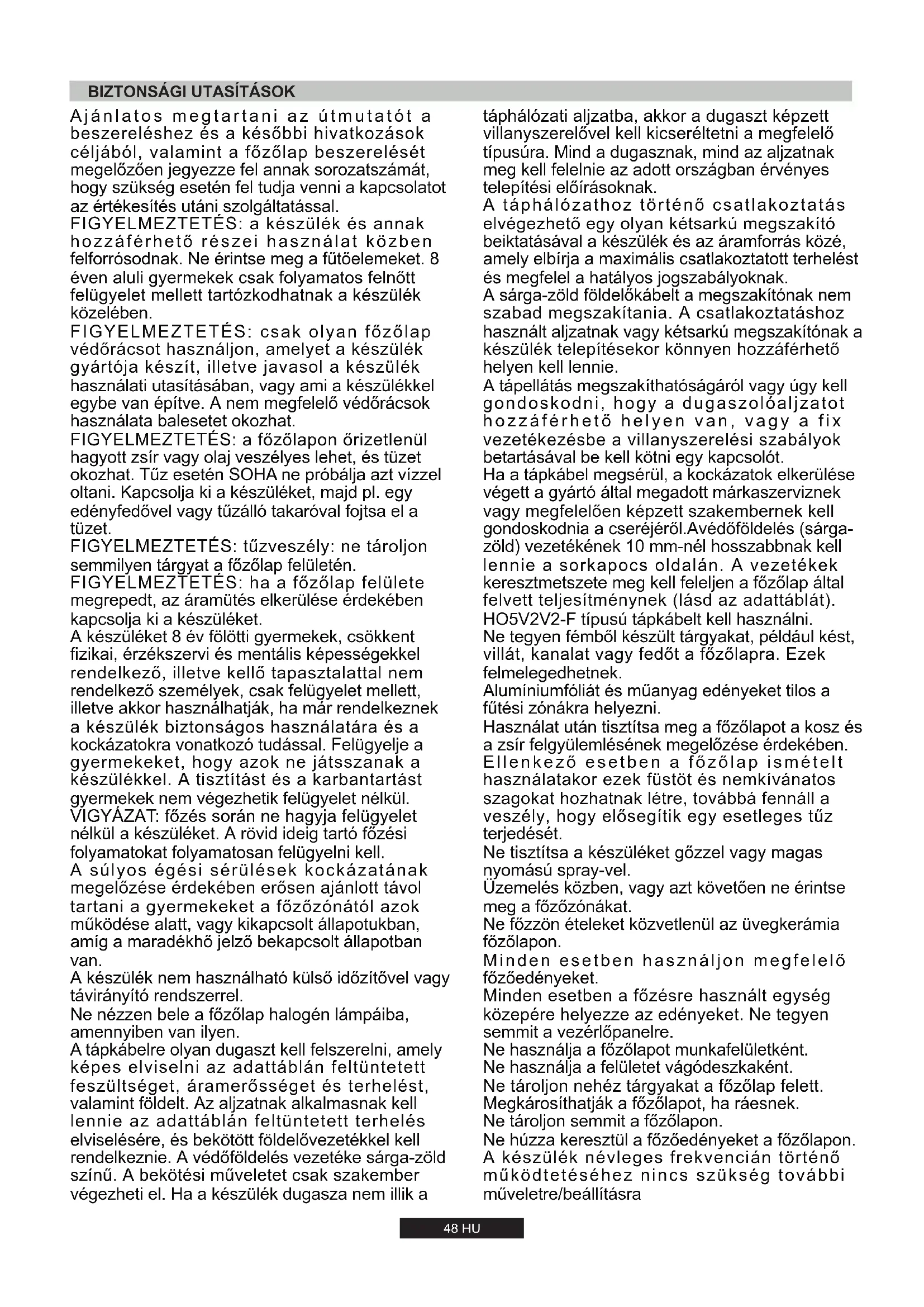 7,7 kW 734 l/h 560 g/h -48 HU FIGYELMEZTETÉS: a főzőlapon őrizetlenül hagyott zsír vagy olaj veszélyes lehet, és tüzet okozhat. Tűz esetén SOHA ne próbálja azt vízzel oltani. Kapcsolja ki a készüléket, majd pl. egy edényfedővel vagy tűzálló takaróval fojtsa el a tüzet. FIGYELMEZTETÉS: a készülék és annak hozzáférhető részei használat közben felforrósodnak. Ne érintse meg a fűtőelemeket. 8 éven aluli gyermekek csak folyamatos felnőtt felügyelet mellett tartózkodhatnak a készülék közelében. FIGYELMEZTETÉS: csak olyan főzőlap védőrácsot használjon, amelyet a készülék gyártója készít, illetve javasol a készülék használati utasításában, vagy ami a készülékkel egybe van építve. A nem megfelelő védőrácsok használata balesetet okozhat. A súlyos égési sérülések kockázatának megelőzése érdekében erősen ajánlott távol tartani a gyermekeket a főzőzónától azok működése alatt, vagy kikapcsolt állapotukban, amíg a maradékhő jelző bekapcsolt állapotban van. A tápkábelre olyan dugaszt kell felszerelni, amely képes elviselni az adattáblán feltüntetett feszültséget, áramerősséget és terhelést, valamint földelt. Az aljzatnak alkalmasnak kell lennie az adattáblán feltüntetett terhelés elviselésére, és bekötött földelővezetékkel kell rendelkeznie. A védőföldelés vezetéke sárga-zöld színű. A bekötési műveletet csak szakember végezheti el. Ha a készülék dugasza nem illik a A készülék nem használható külső időzítővel vagy távirányító rendszerrel. Ajánlatos megtartani az útmutatót a beszereléshez és a későbbi hivatkozások céljából, valamint a főzőlap beszerelését megelőzően jegyezze fel annak sorozatszámát, hogy szükség esetén fel tudja venni a kapcsolatot az értékesítés utáni szolgáltatással. FIGYELMEZTETÉS: tűzveszély: ne tároljon semmilyen tárgyat a főzőlap felületén. FIGYELMEZTETÉS: ha a főzőlap felülete megrepedt, az áramütés elkerülése érdekében kapcsolja ki a készüléket. A készüléket 8 év fölötti gyermekek, csökkent fizikai, érzékszervi és mentális képességekkel rendelkező, illetve kellő tapasztalattal nem rendelkező személyek, csak felügyelet mellett, illetve akkor használhatják, ha már rendelkeznek a készülék biztonságos használatára és a kockázatokra vonatkozó tudással. Felügyelje a gyermekeket, hogy azok ne játsszanak a készülékkel. A tisztítást és a karbantartást gyermekek nem végezhetik felügyelet nélkül. VIGYÁZAT: főzés során ne hagyja felügyelet nélkül a készüléket. A rövid ideig tartó főzési folyamatokat folyamatosan felügyelni kell. Ne nézzen bele a főzőlap halogén lámpáiba, amennyiben van ilyen.