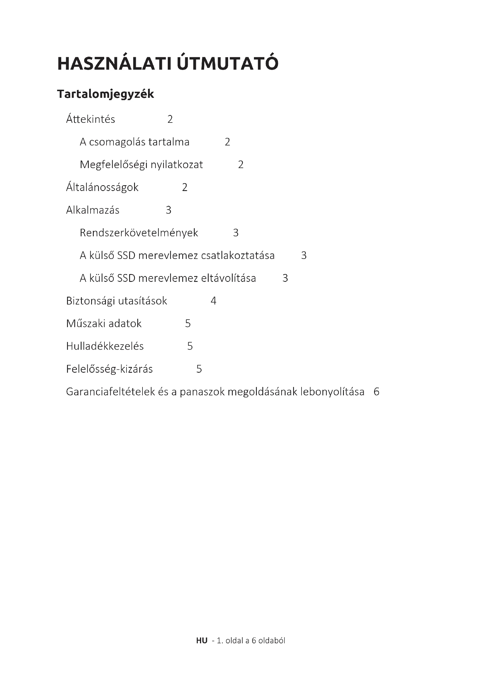 Megfelelőségi nyilatkozat ACEjelöléskimondja,hogyjelentermékteljesíatermékrevonatkozó, érvénybenlévőösszesEUirányelvelőírásait. A csomagolás tartalma ÁTTEKINTÉS JelenkülsőSSDmerevlemezfőcéljaszemélyiszámítógépek,laptopok,ultrabookokvagyMAC számítógépekadatainaktárolása.Aterméketnemszántákkereskedelmihasználatravagyorvosi ésspeciálisalkalmazásokra,amelyeknélatermékmeghibásodásasérüléseket,halálesetetvagy jelentősanyagikárokatokozhat.Rendeltetéstőleltérőhasználateseténérvényétveszía szavatosság.Akészülékáltalunkjóvánemhagyofelnyitása,illetveátépítéseésjóvánemhagyo kiegészítőkészülékekéstartozékokhasználatalos.NehasználjaakülsőSSDmerevlemezt extrémkörnyezefeltételekmelleésvegyegyelembeabiztonságiutasításokat. Jelenútmutatóbantalálhatóinformációkésbiztonságiutasításokbenemtartásaarendeltetéstől eltérőhasználatnakminősülésaszavatosságmegszűnéséteredményeziésszemélyisérülésekhez vagyanyagikárokhozvezethet. Rendeltetésszerű használat