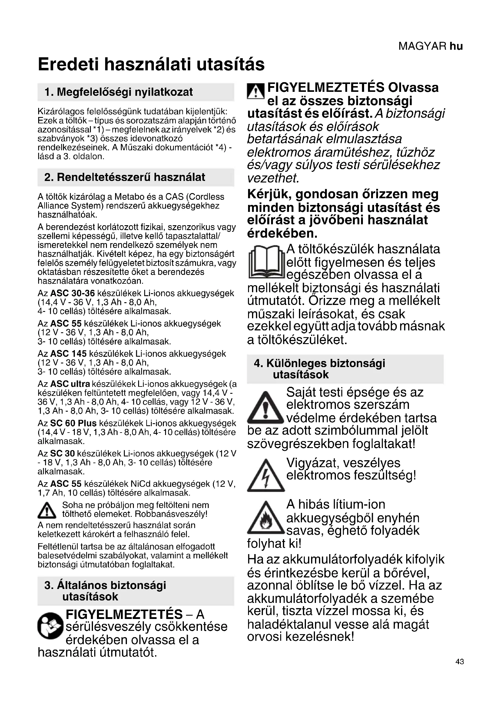 Eredeti használati utasítás Kizárólagos felelősségünk tudatában kijelentjük: Ezek a töltők – típus és sorozatszám alapján történő azonosítással *1) – megfelelnek az irányelvek *2) és szabványok *3) összes idevonatkozó rendelkezéseinek. A Műszaki dokumentációt *4) - lásd a 3. oldalon. A töltők kizárólag a Metabo és a CAS (Cordless Alliance System) rendszerű akkuegységekhez használhatóak. A berendezést korlátozott fizikai, szenzorikus vagy szellemi képességű, illetve kellő tapasztalattal/ ismeretekkel nem rendelkező személyek nem használhatják. Kivételt képez, ha egy biztonságért felelős személy felügyeletet biztosít számukra, vagy oktatásban részesítette őket a berendezés használatára vonatkozóan. Az ASC 30-36 készülékek Li-ionos akkuegységek (14,4 V - 36 V, 1,3 Ah - 8,0 Ah,