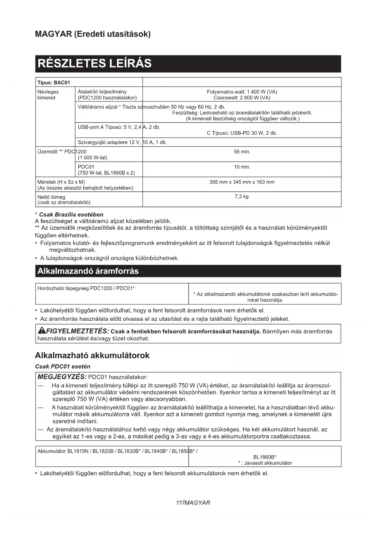 Típus: BAC01 Névleges kimenet Átalakító teljesítmény (PDC1200 használatakor) Folyamatos watt: 1 400 W (VA) Csúcswatt: 2 800 W (VA) Váltóáramú aljzat * Tiszta szinuszhullám 50 Hz vagy 60 Hz, 2 db. Feszültség: Leolvasható az áramátalakítón található jelzésről. (A kimeneti feszültség országtól függően változik.) USB-port A Típusú: 5 V, 2,4 A, 2 db. C Típusú: USB-PD 30 W, 2 db. Szivargyújtó adaptere 12 V, 10 A, 1 db. Üzemidő ** PDC1200 (1 000 W-tal) 56 min. PDC01 (750 W-tal, BL1860B x 2) 10 min. Méretek (H x Sz x M) (Az összes akasztó behajtott helyzetében) 395 mm x 345 mm x 163 mm Nettó tömeg (csak az áramátalakító) 7,3 kg