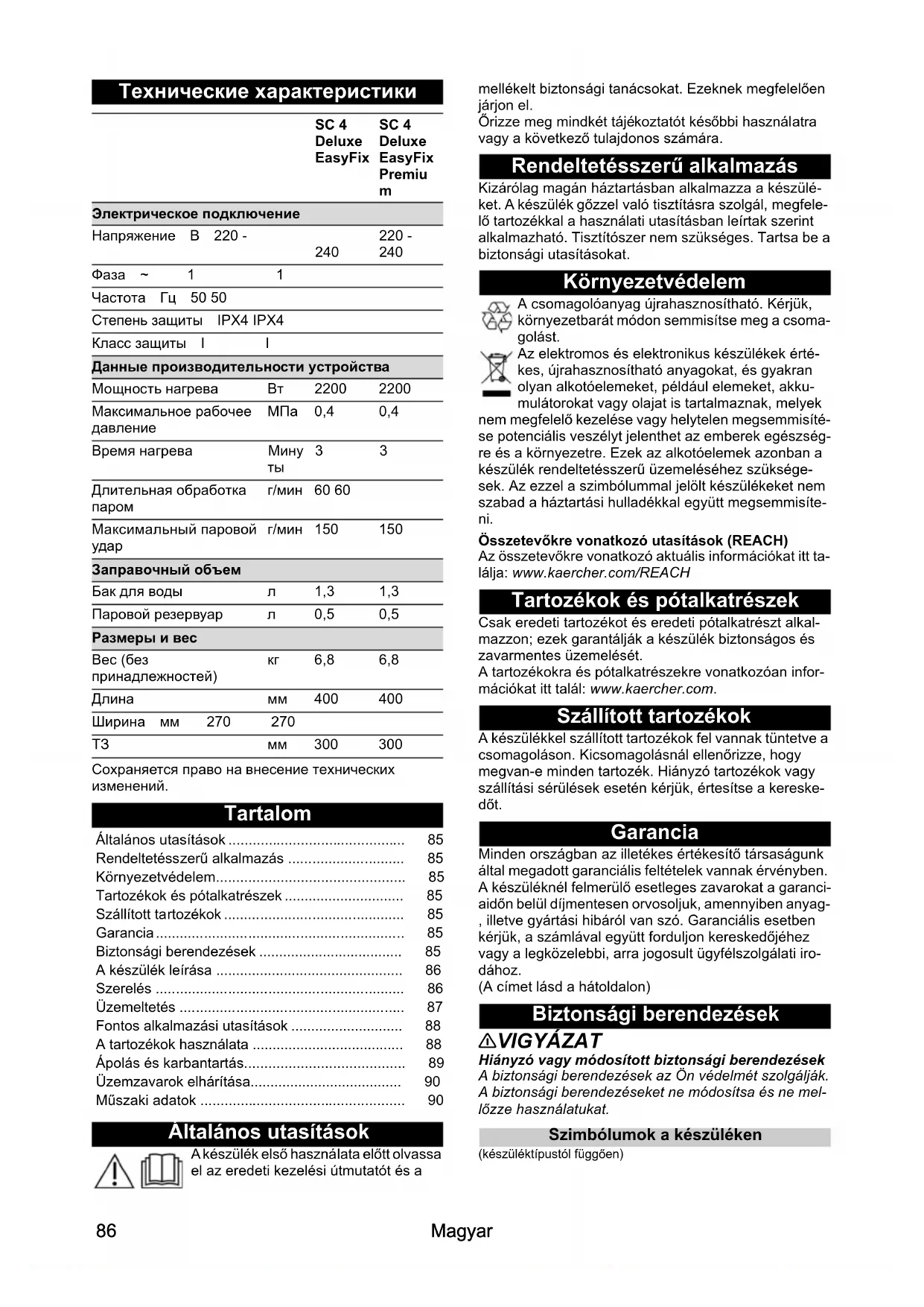 Tartalom Általános utasítások A készülék első használata előtt olvassa el az eredeti kezelési útmutatót és a mellékelt biztonsági tanácsokat. Ezeknek megfelelően járjon el. Őrizze meg mindkét tájékoztatót későbbi használatra vagy a következő tulajdonos számára. Rendeltetésszerű alkalmazás Kizárólag magán háztartásban alkalmazza a készülé- ket. A készülék gőzzel való tisztításra szolgál, megfele- lő tartozékkal a használati utasításban leírtak szerint alkalmazható. Tisztítószer nem szükséges. Tartsa be a biztonsági utasításokat. Környezetvédelem A csomagolóanyag újrahasznosítható. Kérjük, környezetbarát módon semmisítse meg a csoma- golást. Az elektromos és elektronikus készülékek érté- kes, újrahasznosítható anyagokat, és gyakran olyan alkotóelemeket, például elemeket, akku- mulátorokat vagy olajat is tartalmaznak, melyek nem megfelelő kezelése vagy helytelen megsemmisíté- se potenciális veszélyt jelenthet az emberek egészség- re és a környezetre. Ezek az alkotóelemek azonban a készülék rendeltetésszerű üzemeléséhez szüksége- sek. Az ezzel a szimbólummal jelölt készülékeket nem szabad a háztartási hulladékkal együtt megsemmisíte- ni. Összetevőkre vonatkozó utasítások (REACH) Az összetevőkre vonatkozó aktuális információkat itt ta- lálja: www.kaercher.com/REACH Tartozékok és pótalkatrészek Csak eredeti tartozékot és eredeti pótalkatrészt alkal- mazzon; ezek garantálják a készülék biztonságos és zavarmentes üzemelését. A tartozékokra és pótalkatrészekre vonatkozóan infor- mációkat itt talál: www.kaercher.com. Szállított tartozékok A készülékkel szállított tartozékok fel vannak tüntetve a csomagoláson. Kicsomagolásnál ellenőrizze, hogy megvan-e minden tartozék. Hiányzó tartozékok vagy szállítási sérülések esetén kérjük, értesítse a kereske- dőt. Garancia Minden országban az illetékes értékesítő társaságunk által megadott garanciális feltételek vannak érvényben. A készüléknél felmerülő esetleges zavarokat a garanci- aidőn belül díjmentesen orvosoljuk, amennyiben anyag- , illetve gyártási hibáról van szó. Garanciális esetben kérjük, a számlával együtt forduljon kereskedőjéhez vagy a legközelebbi, arra jogosult ügyfélszolgálati iro- dához. (A címet lásd a hátoldalon) Biztonsági berendezések 몇 VIGYÁZAT Hiányzó vagy módosított biztonsági berendezések A biztonsági berendezések az Ön védelmét szolgálják. A biztonsági berendezéseket ne módosítsa és ne mel- lőzze használatukat. Szimbólumok a készüléken (készüléktípustól függően) SC 4 Deluxe EasyFix SC 4 Deluxe EasyFix Premiu