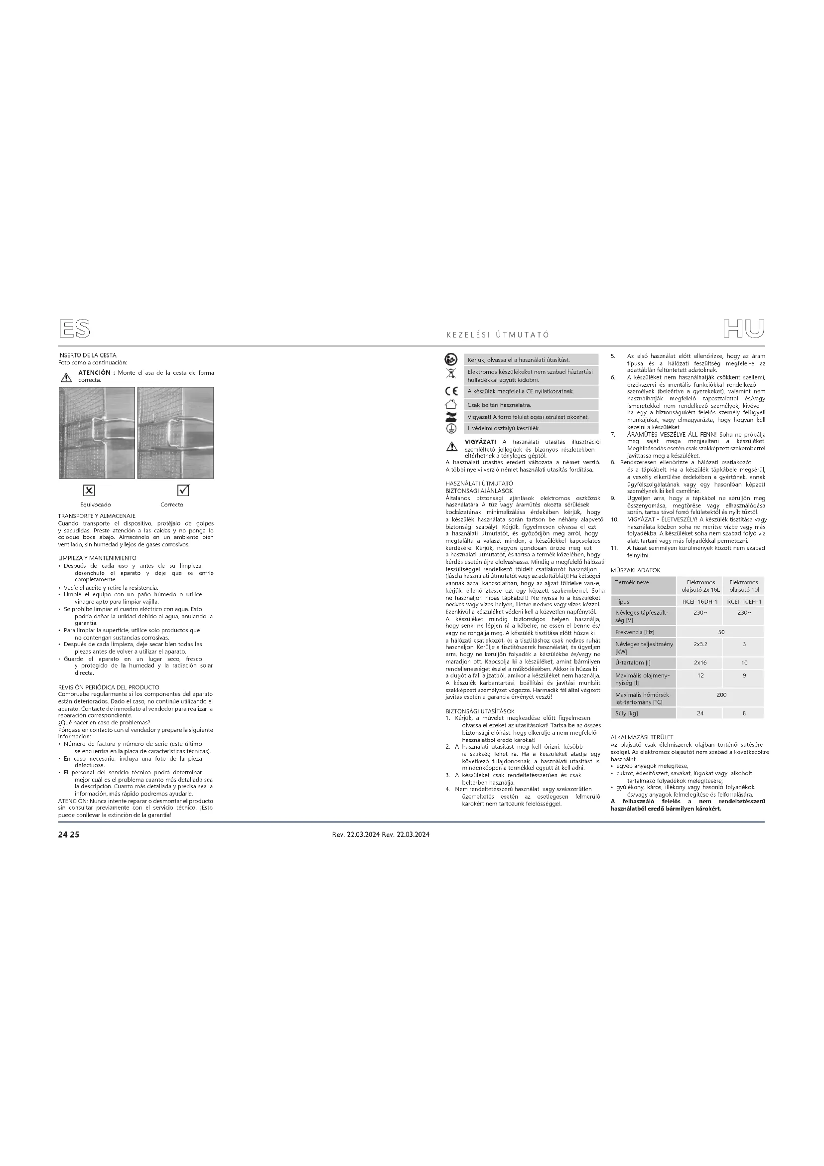 - A szervizképviselő jobban meg tudja ítélni, mi a probléma, ha a lehető legpontosabban leírja a hibát. Minél részletesebb leírást ad, annál gyorsabban fognak tudni segíteni!FIGYELEM: Soha ne nyissa ki a készüléket az ügyfélszolgálattal való konzultáció nélkül. Ez érvénytelenítheti a garanciát! ELSŐ HASZNÁLAT ELŐTT: Ellenőrzés az áru átvételét követően Az áru átvételekor ellenőrizze a csomagolást az esetleges sérülések felfedezése érdekében, és nyissa ki a csomagot. Ha a csomagolás sérült, kérjük, 3 napon belül lépjen kapcsolatba a szállítócéggel vagy a forgalmazóval, és dokumentálja a sérülést a lehető legjobb módon. Kérjük, ne fordítsa fejjel lefelé a csomagot! Ha a csomagot ismételten szállíttatni kívánja, győződjön meg arról, hogy vízszintes, stabil állapotban kerül szállításra.A CSOMAGOLÁS ÁRTALMATLANÍTÁSAKérjük, hogy a csomagolóelemeket (karton, műanyag szalagok és polisztirol) őrizze meg, hogy amennyiben a készüléket szervizelésre vissza kell vinni, az a lehető legjobban védve legyen a szállítás során!A KÉSZÜLÉK ÖSSZESZERELÉSEA készülék elhelyezése A készülék környezetének hőmérséklete nem haladhatja meg a 45°C-ot, és páratartalma nem haladhatja meg a 85%-ot. A készüléket úgy kell elhelyezni, hogy a jó légáramlás biztosítva legyen. A készülék mindegyik falától legalább 10 cm távolságot kell tartani. Tartsa távol a készüléket bármilyen forró felülettől. A készüléket mindig egyenes, stabil, tiszta, tűzálló és száraz felületen kell használni, gyermekek és csökkent szellemi funkciókkal rendelkező személyek számára elérhetetlen helyen. A készüléket úgy kell elhelyezni, hogy a tápkábel villásdugója bármikor elérhető legyen. Ellenőrizni kell, hogy a készülék tápellátása megfelel-e az adattáblán megadott adatoknak! Az első használat előtt szerelje ki az összes elemet és mossa le őket, valamint mossa le az egész készüléket.A KÉSZÜLÉK MŰKÖDÉSE – ALAPVETŐ SZABÁLYOKA FOGANTYÚ FELSZERELÉSE A KOSÁRRAKép az alábbiakban: FIGYELEM! A kosár fogantyúját a megfelelő módon szerelje össze.Téves Megfelelő Rev. 22.03.2024 Rev. 22.03.2024