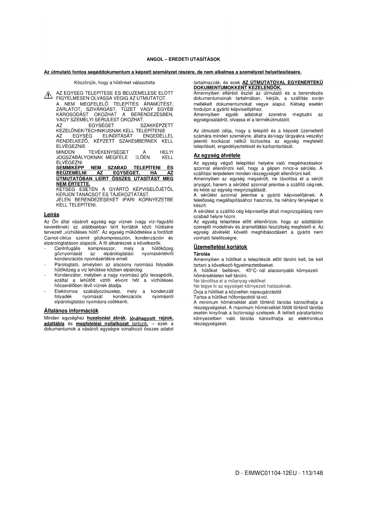 A használt hőtıközegre vonatkozó fontos információk Ez a termék a kiotói egyezményben említett fluortartalmú üvegházhatású gázokat tartalmaz. Ne engedje a gázokat a légkörbe. Hőtıközegtípus: R134a GWP(1)-érték: 1300 (1)GWP = globális felmelegedési potenciál A normál mőködéshez szükséges hőtıközeg-mennyiség az egység adattábláján van feltüntetve. Az egységbe ténylegesen betöltött mennyiség az elektromos panel belsejében elhelyezett ezüst matricán van feltüntetve. Elıfordulhat, hogy az európai vagy helyi jogszabályok a hőtıközeg-szivárgás rendszeres idıközönként való ellenırzését írják elı. További információkért, kérjük, forduljon a legközelebbi forgalmazóhoz. Ártalmatlanítás Az egység fémbıl, mőanyagból és elektronikus részekbıl áll. Az összes ilyen alkatrészt az ártalmatlanításra vonatkozó helyi jogszabályoknak megfelelıen kell ártalmatlanítani. Az ólomakkumulátorokat össze kell győjteni, és különleges hulladékbegyőjtı központba kell küldeni. Az olajat össze kell győjteni, és különleges hulladékbegyőjtı központba kell küldeni.D - EIMWC01104-12EU - 118/148