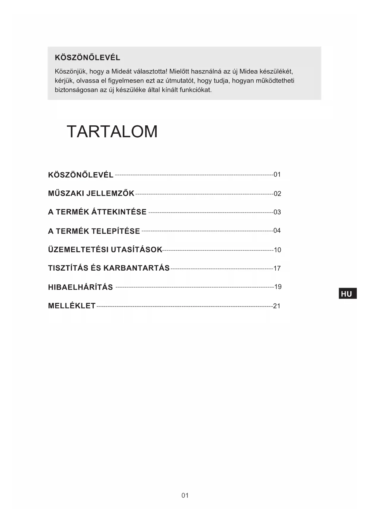 Köszönjük, hogy a Mideát választotta! Mielőtt használná az új Midea készülékét, kérjük, olvassa el figyelmesen ezt az útmutatót, hogy tudja, hogyan működtetheti biztonságosan az új készüléke által kínált funkciókat. TARTALOM