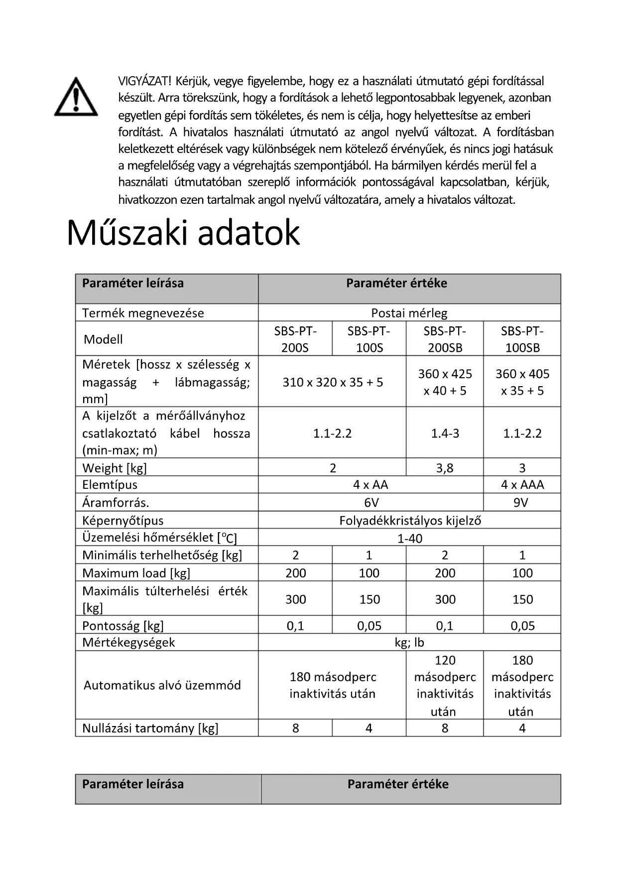 Paraméter leírása Paraméter értéke VIGYÁZAT! Kérjük, vegye figyelembe, hogy ez a használati útmutató gépi fordítással készült. Arra törekszünk, hogy a fordítások a lehető legpontosabbak legyenek, azonban egyetlen gépi fordítás sem tökéletes, és nem is célja, hogy helyettesítse az emberi fordítást. A hivatalos használati útmutató az angol nyelvű változat. A fordításban keletkezett eltérések vagy különbségek nem kötelező érvényűek, és nincs jogi hatásuk a megfelelőség vagy a végrehajtás szempontjából. Ha bármilyen kérdés merül fel a használati útmutatóban szereplő információk pontosságával kapcsolatban, kérjük, hivatkozzon ezen tartalmak angol nyelvű változatára, amely a hivatalos változat.Termék megnevezése Postai mérleg Modell SBS-PT-200SK SBS-PT-100SK Méret (szélesség x mélység x magasság) [mm] 360 x 405 x 65 Kijelző méretei [mm] 135 x 65 Weight [kg] 3,5 Elemtípus 4 x AA Áramforrás.