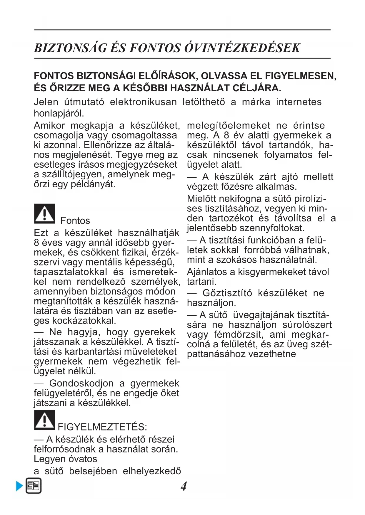BIZTONSÁG ÉS FONTOS ÓVINTÉZKEDÉSEK Amikor megkapja a készüléket, csomagolja vagy csomagoltassa ki azonnal. Ellenőrizze az általá- nos megjelenését. Tegye meg az esetleges írásos megjegyzéseket a szállítójegyen, amelynek meg- őrzi egy példányát. Fontos Ezt a készüléket használhatják 8 éves vagy annál idősebb gyer- mekek, és csökkent zikai, érzék- szervi vagy mentális képességű, tapasztalatokkal és ismeretek- kel nem rendelkező személyek, amennyiben biztonságos módon megtanították a készülék haszná- latára és tisztában van az esetle- ges kockázatokkal. — Ne hagyja, hogy gyerekek játsszanak a készülékkel. A tisztí- tási és karbantartási műveleteket gyermekek nem végezhetik fel- ügyelet nélkül. — Gondoskodjon a gyermekek felügyeletéről, és ne engedje őket játszani a készülékkel. FIGYELMEZTETÉS: — A készülék és elérhető részei felforrósodnak a használat során. Legyen óvatos a sütő belsejében elhelyezkedő melegítőelemeket ne érintse meg. A 8 év alatti gyermekek a készüléktől távol tartandók, ha- csak nincsenek folyamatos fel- ügyelet alatt. — A készülék zárt ajtó mellett végzett főzésre alkalmas. Mielőtt nekifogna a sütő pirolízi- ses tisztításához, vegyen ki min- den tartozékot és távolítsa el a jelentősebb szennyfoltokat. — A tisztítási funkcióban a felü- letek sokkal forróbbá válhatnak, mint a szokásos használatnál. Ajánlatos a kisgyermekeket távol tartani. — Gőztisztító készüléket ne használjon. — A sütő üvegajtajának tisztítá- sára ne használjon súrolószert vagy fémdörzsit, ami megkar- colná a felületét, és az üveg szét- pattanásához vezethetne FONTOSBIZTONSÁGIELŐÍRÁSOK,OLVASSAELFIGYELMESEN, ÉSŐRIZZEMEGAKÉSŐBBIHASZNÁLATCÉLJÁRA. Jelen útmutató elektronikusan letölthető a márka internetes honlapjáról.5 BIZTONSÁG ÉS FONTOS ÓVINTÉZKEDÉSEK FIGYELMEZTETÉS: Győződjön meg arról, hogy a ké- szülék ki van kapcsolva mielőtt kicserélné a lámpát, az áramü- tés veszélyének elkerülése ér- dekében. Csak akkor nyúljon a készülékhez, ha már kihűlt. Az üvegbura és a lámpa kicsavará- sának megkönnyítéséhez hasz- náljon gumikesztyűt. Biztosítani kell a készülék le- csatlakoztatását a villamos háló- zatról, egy kapcsoló beépítésével a x vezetékekbe, a felszerelési útmutatónak megfelelően. — Ha a tápkábel megsérült, a gyártónak, a gyártó szervizszol- gálatának vagy egy hasonló képzettségű szakembernek kell kicserélnie a veszélyek elkerü- lése érdekében. — A készülék egyaránt besze- relhető konyhai pultra vagy füg- gőleges elrendezésű bútorba, a szerelési ábrának megfelelően. — A sütőt helyezze a bútorban középre, biztosítva legalább 10 mm távolságot a szomszédos bútortól. A beépítésre szolgáló bútor anyagának hőállónak kell lennie (vagy ilyen bevonattal kell rendelkeznie). A fokozottabb sta- bilitás érdekében rögzítse a sütőt a bútorhoz 2 csavarral a sütő ol- dalsó tartóin erre a célra szolgáló furatokon keresztül. — A készüléket a túlmelegedés elkerülése érdekében nem sza- bad dekoratív ajtó mögé felsze- relni. — A készülék háztartási vagy annak megfelelő jellegű hasz- nálatra szolgál, például: üzle- tek, irodák és egyéb szakmai környezetek személyzete ré- szére fenntartott munkahelyi étkezőhelységben való haszná- lat; üzemekben való használat; szállodák, motelek és egyéb, szálláshely jellegű környezetek vendégei általi használat; ven- dégszoba típusú szálláshelyeken történő használat. — A sütő üregében végzett min- den tisztítási beavatkozáshoz ki kell kapcsolni a sütőt. Ne módosítsa a készülék jellem- zőit, mert ez veszélyt jelenthet Önre. Ne használja a sütőt éléskamra- ként vagy bármilyen alkotóelem tárolására a használat után.6