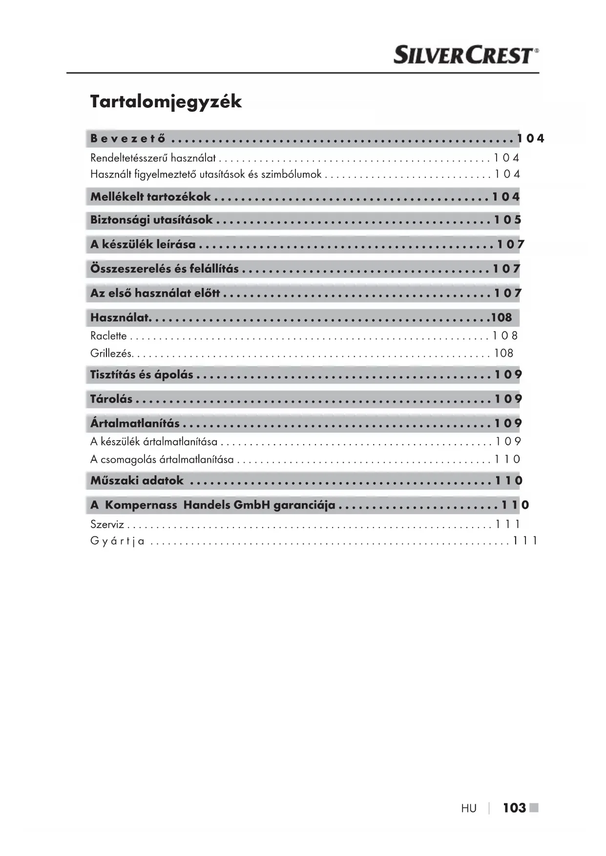 HU Bevezető Gratulálunk új készüléke megvásárlásához! Vásárlásával egy kiváló minőségű termék mellett döntött. A használati útmutató a termék része. Fontos tudnivalókat tartalmaz a bizton- ságra, a használatra és az ártalmatlanításra vonatkozóan. A termék használata előtt ismer- kedjen meg valamennyi használati és biztonsági tudnivalóval. A terméket csak a leírtak szerint és a megadott célokra használja. A termék harma- dik személynek történő továbbadása esetén adja át a termékhez tartozó valamennyi leírást is. Rendeltetésszerű használat Ez a készülék kizárólag élelmiszerek beltéri grillezésére és párolására szolgál. A készülék kizárólag magánháztartásokban használható. Ne használja üzleti célokra. Használt figyelmeztető utasítások és szimbólumok Ebben a használati útmutatóban, a csomagolá- son és a készüléken a következő figyelmeztető utasításokat és szimbólumokat használjuk (ha vannak ilyenek): VESZÉLY! Az ezzel a szimbólummal és a „VESZÉLY” figyelmeztető szóval ellátott figyelmeztető utasítás olyan közvetlen veszélyes helyzetre figyel- meztet, amely halált vagy súlyos sérülést okoz, ha nem előzik meg. FIGYELMEZTETÉS! Az ezzel a szimbólummal és a „FIGYELMEZ- TETÉS” figyelmeztető szóval ellátott figyelmeztető utasítás olyan lehetsé- ges veszélyes helyzetre figyelmeztet, amely halált vagy súlyos sérülést okozhat, ha nem előzik meg. VIGYÁZAT! Az ezzel a szimbólum- mal és a „VIGYÁZAT” figyelmeztető szóval ellátott figyelmeztető utasítás olyan lehetséges veszélyes helyzetre figyelmeztet, amely csekély vagy enyhe sérülést okozhat, ha nem előzik meg. FIGYELEM! Az ezzel a szimbólum- mal és a „FIGYELEM” figyelmeztető szóval ellátott figyelmeztető utasítás olyan lehetséges helyzetre figyelmez- tet, amely anyagi károkat okozhat, ha nem előzik meg. Tudnivaló jelöli a kiegészítő infor- mációkat, amelyek megkönnyítik a készülék használatát. Váltóáram/-feszültség A készülék élelmiszerekkel érintkező részei élelmiszerbiztosak. Mosogatógépben tisztítható Tartsa be a használati útmutatóban leírtakat Mellékelt tartozékok Raclette grill (alap és grill-lemez) 10 serpenyő 10 lapát Használati útmutató Tudnivaló ► Közvetlenül kicsomagolás után ellenőrizze a csomag tartalmának teljességét és épségét. Szükség esetén forduljon a szervizhez. IB_460256_SRGM1500B2_LB8.indb 104 11.06.2024 10:38:02HU
