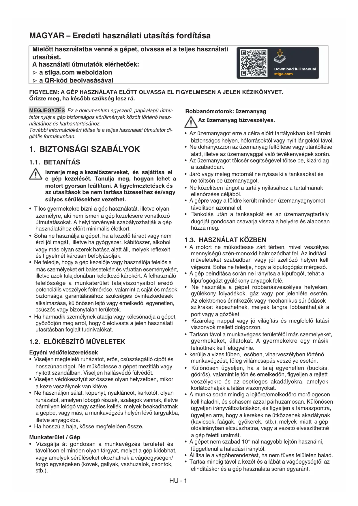 radi. Akumulator je napunjen. Osigurač 5:A je pregorio. Zamijenite osigurač 5:A. NAPOMENA Ako problemi potraju i nakon primjene opisanih načina rješavanja, obratite se svom prodavaču. NAPOMENA U slučaju da dođe do drugih problema, koji nisu navedeni u tablici, odmah se obratite ovlaštenom servi- snom centru.HU - 1 Mielőtt használatba venné a gépet, olvassa el a teljes használati utasítást. A használati útmutatók elérhetőek: ▷ a stiga.com weboldalon ▷ a QR-kód beolvasásával Download full manual stiga.com MAGYAR – Eredeti használati utasítás fordítása FIGYELEM: A GÉP HASZNÁLATA ELŐTT OLVASSA EL FIGYELMESEN A JELEN KÉZIKÖNYVET. Őrizze meg, ha később szükség lesz rá. MEGJEGYZÉS Ez a dokumentum egyszerű, papíralapú útmu- tatót nyújt a gép biztonságos körülmények között történő hasz- nálatához és karbantartásához. További információkért töltse le a teljes használati útmutatót di- gitális formátumban.