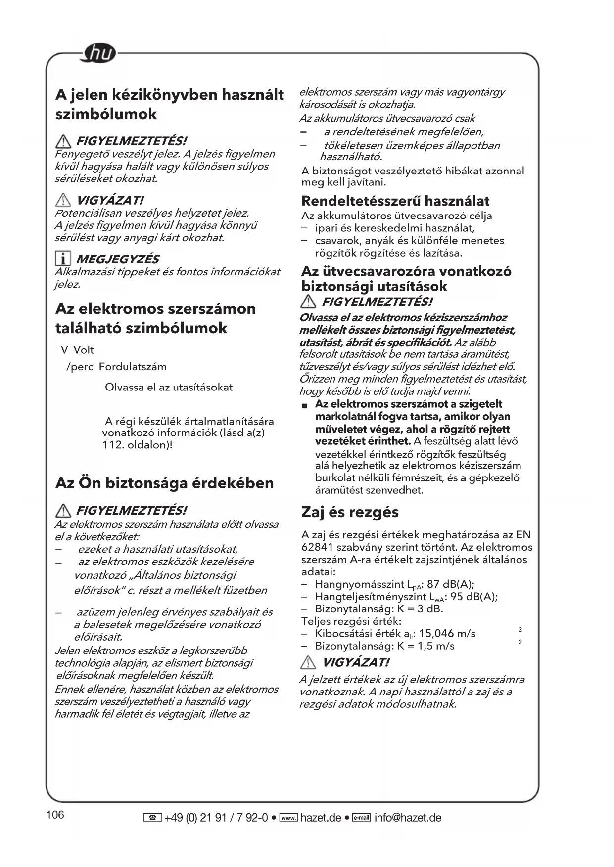 info@hazet.de Ártalmatlanításra vonatkozó információk FIGYELMEZTETÉS! Tegye használhatatlanná a redundáns elektromos szerszámokat: az akkumulátorral működő elektromos szerszámokat az akkumulátor eltávolításával. Csak EU tagállamokNe dobjon elektromos szerszámokat a háztartási hulladékok közé!Az elektromos és elektronikus berendezések hulladékairól szóló 2012/19/EU irányelvvel és ennek nemzeti jogszabályokba átültetett előírásaival összhangban az elektromos szerszámgépeket elkülönítve kell összegyűjteni és gondoskodni kell a környezetbarát újrahasznosításukról. Nyersanyag újrahasznosítás a hulladék ártalmatlanítása helyett. Gondoskodni kell az eszköz, a tartozékok és a csomagolóanyagok környezetbarát újrahasznosításáról. A műanyag alkatrészek újrahasznosítása az anyag típusának függvényében történik. FIGYELMEZTETÉS! Az akkumulátoregységet/akkumulátort ne dobja a háztartási hulladékok közé, tűzbe vagy vízbe. Ne nyissa fel a használt akkumulátorokat. Csak EU tagállamok:A 2006/66/EK irányelv értelmében gondoskodni kell a hibás vagy használt akkumulátorok újrahasznosításáról. MEGJEGYZÉS Kérjük, hogy érdeklődjön az ártalmatlanítási lehetőségekről abban az üzletben, ahol a terméket vásárolta! -Megfelelőségi nyilatkozat Felelősségünk teljes tudatában kijelentjük, hogy a „Műszaki specifikációk”-ban leírt termék megfelel a következő szabványoknak vagy normatív dokumentumoknak:EN 62841 összhangban a 2014/30/EU, 2006/42/EK, 2011/65/EU irányelvekkel.A műszaki dokumentumokért felelős: Felelősség alóli mentesség A gyártó és képviselője nem vállal felelősséget semmilyen, a termék vagy egy használhatatlan termék által okozott működési zavar miatt bekövetkezett kárért és kiesett nyereségért.A gyártó és képviselője nem vállal felelősséget semmilyen kárért, amelyet a termék helytelen használata vagy a termék más gyártók termékeivel együtt történő használata okozott. A műszaki dokumentumokért felelős: HAZET-WERK Hermann Zerver GmbH & Co. KG, Güldenwerther Bahnhofstraße 25 - 29 42857 Remscheid GERMANY i.V. Volker Grünberg A minőségbiztosítási részleg (QD) vezetője