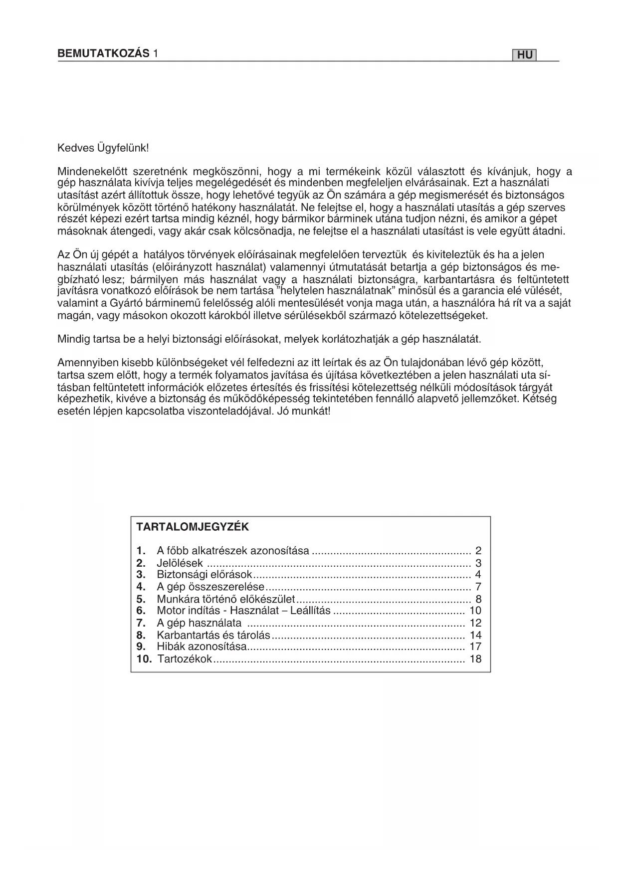 Mindenekelott szeretnénk megkoszönni, hogy a mi termekeink kozul valasztott es kivanjuk, hogy a gép hasznalata kivívja teljes megelégedését és mindenben megfeleljen elvarásainak. Ezt a hasznalati utasítast azér allitottuk össze, hogy lehetöve tegyuk az On szárára a gép megismerését és biztonságos körülmenyek kozött történy hatékony hasznalatát. Ne felejtse el, hogy a hasznalati utasítás a gép szerves résztét képezi ezert tartsa mindig keznel, hogy barmikor barminek utána tudjon nezni, és amikor a gépet masoknak atengedi, vagy akár csak kölcsönadja, ne felejtse el a hasznalati utasítást is vele együtt átadni.