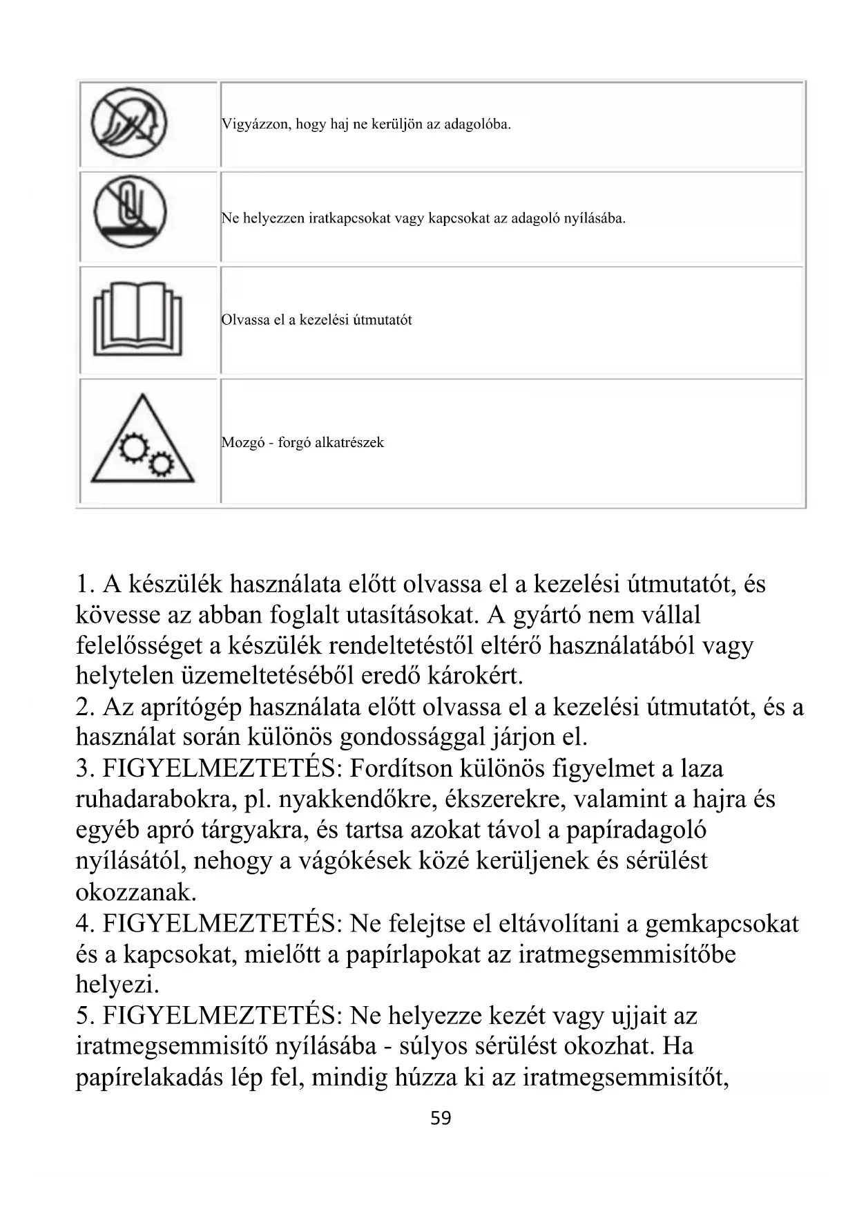 megszüntetésének elősegítésére szolgál, megfordítja a kések folyamatát, így a kések megtisztíthatók. 3.OFF (C) állásba. A tartály (2) kiürítésekor, tisztításkor és akkor szükséges, amikor az aprítógép nincs használatban. A tartály kiürítése A kosarat akkor ajánlott kiüríteni, amikor az ¾-ig megtelt. Ehhez kapcsolja a kapcsolót (4) OFF állásba, és húzza ki a tápkábelt a konnektorból. FIGYELEM A folyamatos aprítás működési ciklusa maximális kapacitáson 2 perc. Ezt követően a készüléket 30 percre ki kell kapcsolni. Papírelakadás esetén a kések tisztításához állítsa a kapcsolót (4) REV állásba. Ezután húzza ki a hálózati kábelt a konnektorból, húzza ki a maradék papírlapokat az adagolónyílásból. Távolítsa el a papír vágatlan részét a tetejéről, és tisztítsa meg a felesleges papírdarabokat az adagolónyílásból. !!! Vigyázzon, hogy ujjait ne tegye az adagolónyílás és a pengék közelébe, mert ez súlyos sérülést okozhat. A gép tisztítása: A készülék tisztítása előtt kapcsolja a kapcsolót (4) OFF állásba, és húzza ki a dugót a hálózati aljzatból. Tisztítsa meg nedves, majd száraz ruhával (vagy papírtörlővel). Ne merítse a készüléket vízbe. Ne fröcskölje le a vágókéseket semmivel. Műszaki adatok: Vágókazetta kapacitása : 5 A4-es lap 80g/m2-ig, Biztonsági szint: P-1 Papírvágási szélesség: 6,8 mm Zajszint: 72 dB Üzemidő: 1,5 perc: 2 perc Szünet: 30 perc Teljesítmény: 150W Feszültség: 50/60Hz: 220-240V ~ 50/60Hz65