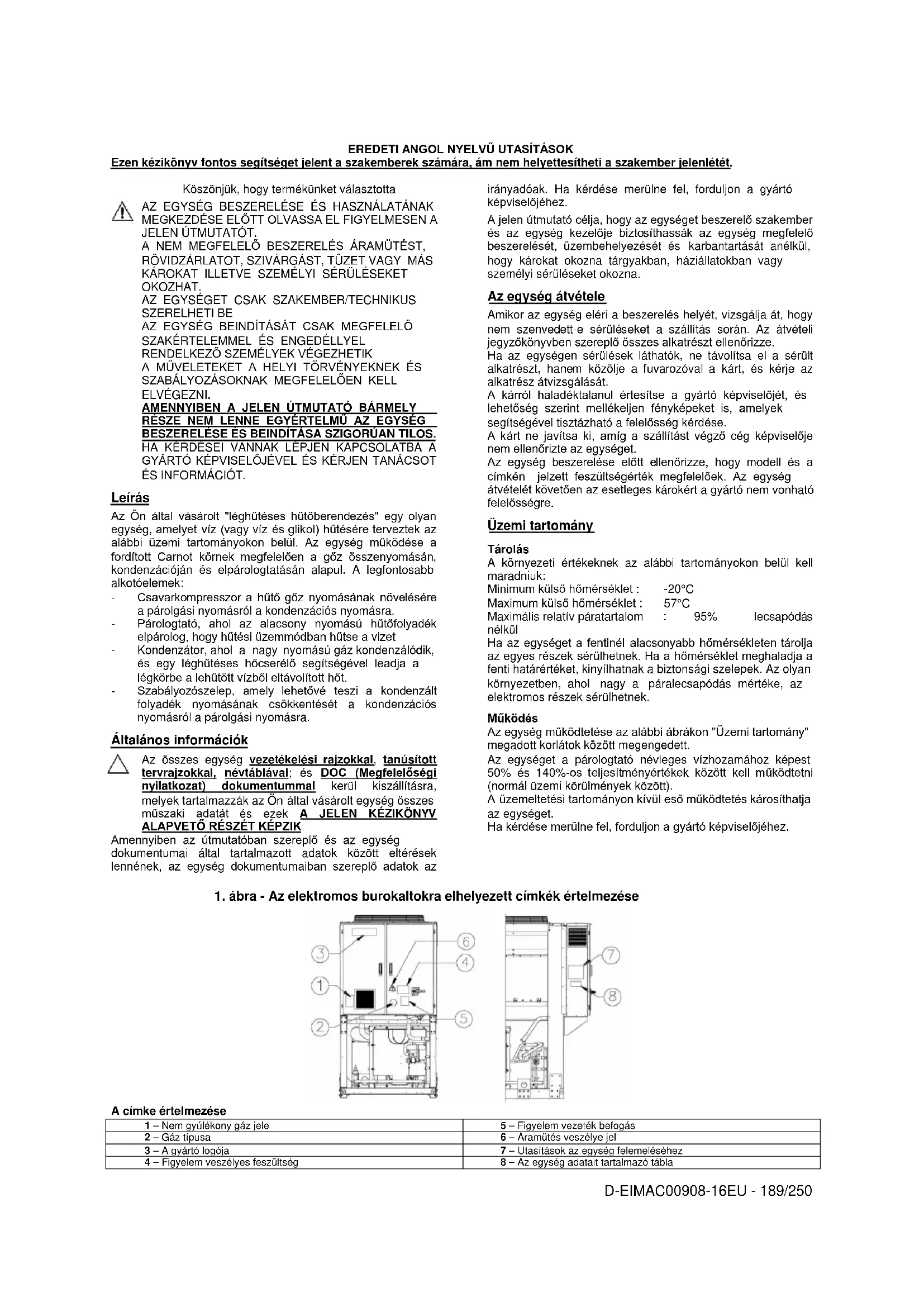A címke értelmezése 1 – Nem gyúlékony gáz jele 5 – Figyelem vezeték befogás 2 – Gáz típusa 6 – Áramütés veszélye jel 3 – A gyártó logója 7 – Utasítások az egység felemeléséhez 4 – Figyelem veszélyes feszültség 8 – Az egység adatait tartalmazó táblaD-EIMAC00908-16EU - 190/250