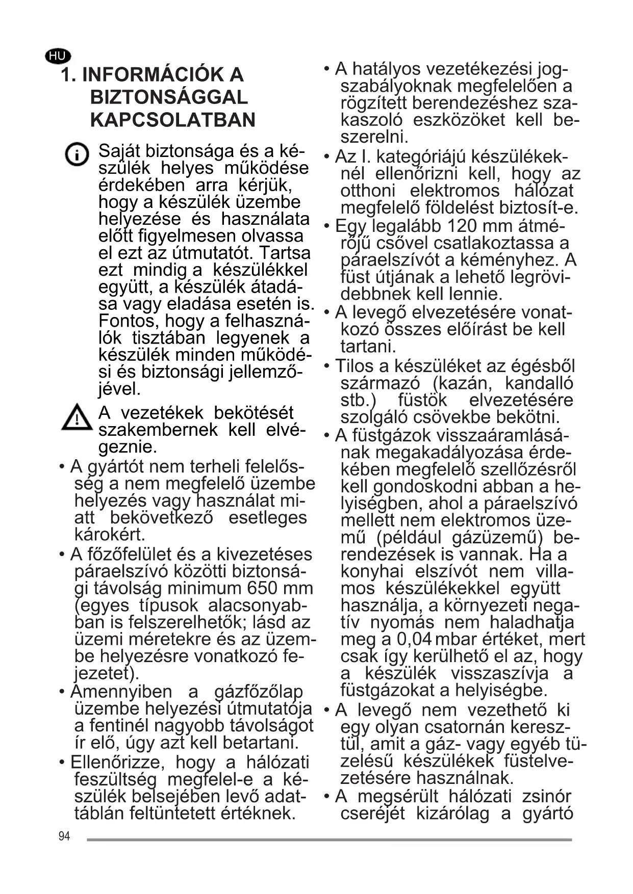 - A füstgázok visszaáramlásá- nak megakadályozása érde- kében megfelelő szellőzésről kell gondoskodni abban a he- lyiségben, ahol a páraelszívó mellett nem elektromos üze- mű (például gázüzemű) be- rendezések is vannak. Ha a konyhai elszívót nem villa- mos készülékekkel együtt használja, a környezeti nega- tív nyomás nem haladhatja meg a 0,04 mbar értéket, mert csak így kerülhető el az, hogy a készülék visszaszívja a füstgázokat a helyiségbe.