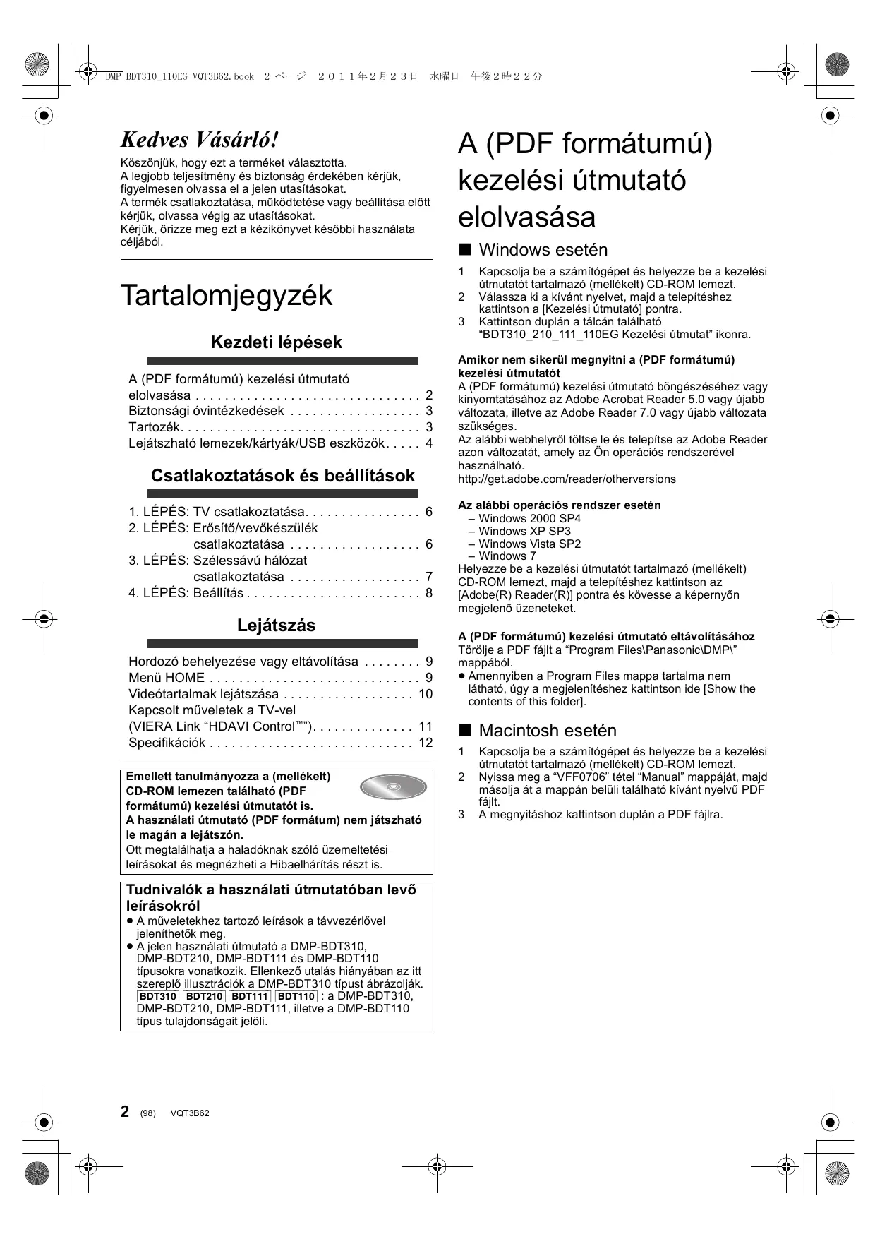 Kapcsolja be a számítógépet és helyezze be a kezelési útmutatót tartalmazó (mellékelt) CD-ROM lemezt. Válassza ki a kívánt nyelvet, majd a telepítéshez kattintson a [Kezelési útmutató] pontra. Kattintson duplán a tálcán található “BDT310_210_111_110EG Kezelési útmutat” ikonra. Amikor nem sikerül megnyitni a (PDF formátumú) kezelési útmutatót A (PDF formátumú) kezelési útmutató böngészéséhez vagy kinyomtatásához az Adobe Acrobat Reader 5.0 vagy újabb változata, illetve az Adobe Reader 7.0 vagy újabb változata szükséges. Az alábbi webhelyről töltse le és telepítse az Adobe Reader azon változatát, amely az Ön operációs rendszerével használható. http://get.adobe.com/reader/otherversions Az alábbi operációs rendszer esetén – Windows 2000 SP4 – Windows XP SP3 – Windows Vista SP2 – Windows 7 Helyezze be a kezelési útmutatót tartalmazó (mellékelt) CD-ROM lemezt, majd a telepítéshez kattintson az [Adobe(R) Reader(R)] pontra és kövesse a képernyőn megjelenő üzeneteket. A (PDF formátumú) kezelési útmutató eltávolításához Törölje a PDF fájlt a “Program Files\Panasonic\DMP\” mappából. ≥ Amennyiben a Program Files mappa tartalma nem látható, úgy a megjelenítéshez kattintson ide [Show the contents of this folder]. ∫ Macintosh esetén