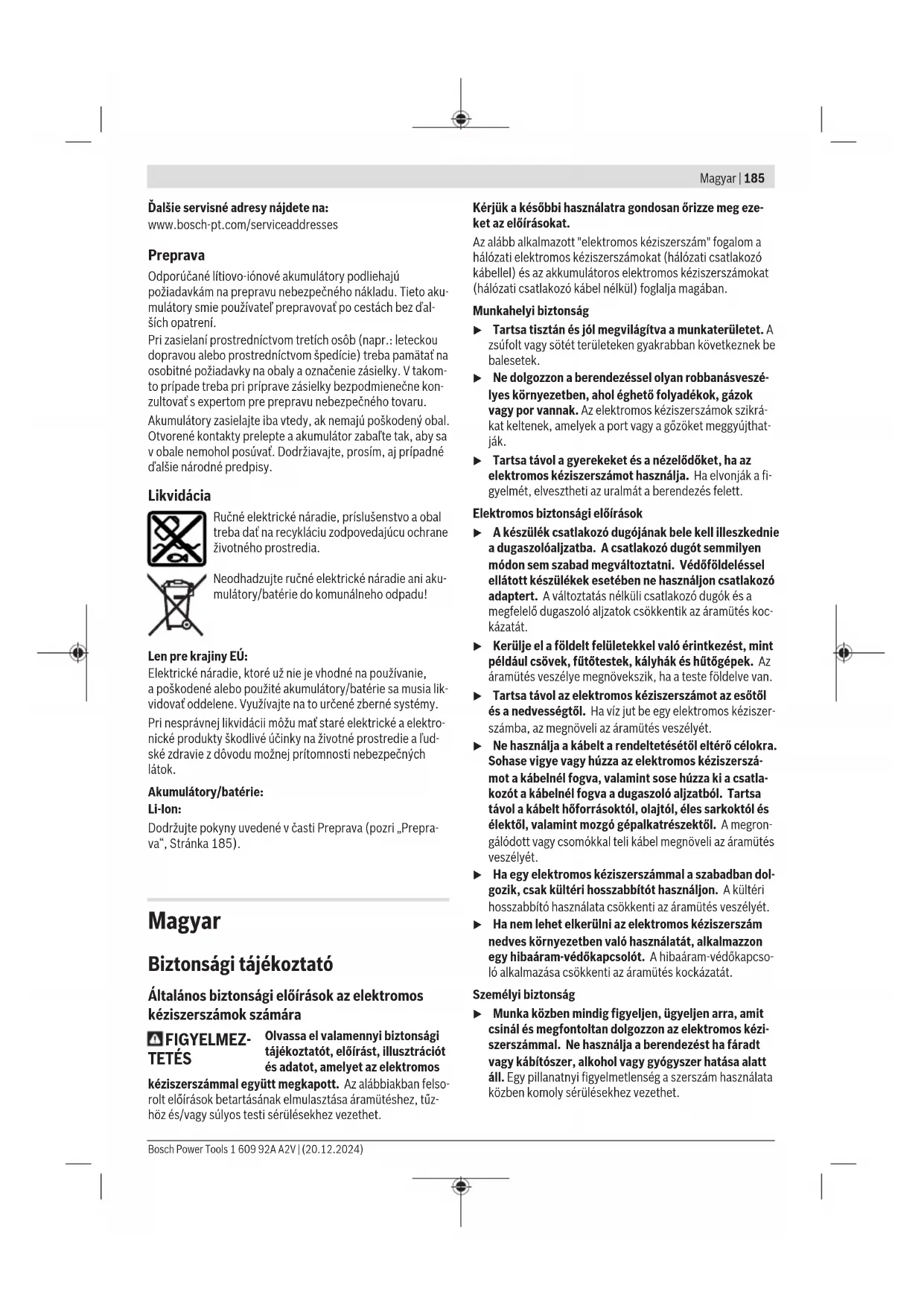 és a tárolás során °C −20…+50 Javasolt akkumulátorok GBA18V… ProCORE18V… Javasolt töltőkészülékek GAL18… GAX18… GAL36… A kéziszerszámhoz használható fűrészlapok méretei Max. fűrészlapátmérő D mm 355 Fűrészlap-magvastagság mm 1,8–2,5 Furatátmérő d mm 25,4 A) Súly akkumulátor nélkül (az akkumulátor súlyát lásd http://www.bosch-professional.com) B) <0°C hőmérsékletek mellett korlátozott teljesítmény Az értékek termékenként változhatnak és függnek az alkalmazási, va- lamint környezeti feltételektől is. További információk a www.bosch-professional.com/wac címen találhatók. Zaj adatok A zajkibocsátási értékek a ENIEC62841-1 szabványnak megfelelően kerültek meghatározásra. Az elektromos kéziszerszám A-értékelésű zajszintjének tipi- kus értékei: hangnyomásszint 91dB(A); hangteljesítmény- szint 100dB(A). A szórás, K=3dB. Viseljen fülvédőt! Az ezen előírásokban megadott zajkibocsátási érték egy szabványban rögzített mérési módszerrel került meghatáro- zásra és az elektromos kéziszerszámok összehasonlítására ez az érték felhasználható. Ez az érték a zajkibocsátás ideig- lenes becslésére is alkalmas. A megadott zajkibocsátási érték az elektromos kéziszerszám fő alkalmazási területeire vonatkozik. Ha azonban az elektro- mos kéziszerszámot más célokra, eltérő betétszerszámok- kal, vagy nem kielégítő karbantartás mellett használják, a zaj- kibocsátási érték a fenti értékektől eltérhet. Ez az egész munkaidőre vonatkozó zajkibocsátást lényegesen megnövel- heti. A zajkibocsátás pontos megbecsüléséhez figyelembe kell venni azokat az időszakokat is, amikor a készülék kikapcsolt állapotban van, vagy amikor be van ugyan kapcsolva, de nem kerül ténylegesen használatra. Ez az egész munkaidőre vo- natkozó zajkibocsátást lényegesen csökkentheti. Akkumulátor A Bosch vállalat az akkumulátoros elektromos kéziszerszá- mokat akkumulátorok nélkül is árusítja. Azt, hogy az Ön elektromos kéziszerszámának szállítási terjedelme egy akku- mulátort is magában foglal-e, a csomagolásról lehet leolvas- ni. Az akkumulátor feltöltése u Csak a Műszaki Adatoknál megadott töltőkészüléke- ket használja. Csak ezek a töltőkészülékek felelnek meg pontosan az Ön elektromos kéziszerszámában alkalma- zásra kerülő Li‑ion-akkumulátornak. Figyelem: A lítium-ion-akkumulátorok a nemzetközi szállítási előírásoknak megfelelően csak részben feltöltve kerülnek ki- szállításra. Az akkumulátor teljes teljesítményének biztosítá- sára az első alkalmazás előtt töltse fel teljesen az akkumulá- tort. Az akkumulátor beszerelése Tolja be a feltöltött akkumulátort az akkumulátor fogadó egy- ségbe, amíg az érezhetően bepattan. Az akkumulátor kivétele Az akkumulátor eltávolításához nyomja meg az akkumulátor reteszelésfeloldó gombot és húzza ki az akkumulátort. Ne erőltesse a kihúzást. Az akkumulátor 2reteszelővállal van ellátva, amelyek meggá- tolják, hogy az akkumulátor az akkumulátor reteszelésfeloldó gomb akaratlan megnyomásakor kiessen. Amíg az akkumulá- tor be van helyezve az elektromos kéziszerszámba, azt egy rugó a helyén tartja. Bosch Power Tools 1 609 92A A2V | (20.12.2024)192 | Magyar Akkumulátor töltöttségi szint kijelző Megjegyzés: Nem minden akkumulátortípus rendelkezik töl- tésiállapot-kijelzővel. Az akkumulátor töltési szint kijelző display zöld LED-jei az ak- kumulátor töltési szintjét mutatják. A töltöttségi szintet biz- tonsági okokból csak használaton kívüli elektromos kéziszer- szám esetén lehet lekérdezni. Nyomja meg a vagy a feltöltési szint kijelző gombot, hogy kijelezze a töltési szintet. Erre kivett akkumulátor ese- tén is van lehetőség. Ha az akkumulátor feltöltési szint kijelző gomb megnyomása után egy LED sem világít, az akkumulátor meghibásodott és ki kell cserélni. Akkumulátor típus: GBA 18V... LED Kapacitás Tartós fény, 3×zöld 60–100% Tartós fény, 2×zöld 30–60% Tartós fény, 1×zöld 5–30% Villogó fény, 1×zöld 0–5% Akkumulátor típus: ProCORE18V... LED Kapacitás Tartós fény, 5×zöld 80–100% Tartós fény, 4×zöld 60–80% Tartós fény, 3×zöld 40–60% Tartós fény, 2×zöld 20–40% Tartós fény, 1×zöld 5–20% Villogó fény, 1×zöld 0–5% Tájékoztató az akkumulátor optimális kezeléséhez Óvja meg az akkumulátort a nedvességtől és a víztől. Az akkumulátort csak a –20°C...50°C hőmérséklet tarto- mányban szabad tárolni. Ne hagyja például az akkumulátort nyáron egy gépjárműben. Időnként tisztítsa meg az akkumulátor szellőzőrését egy pu- ha, tiszta és száraz ecsettel. Ha az akkumulátor feltöltése után a készülék már csak lénye- gesen rövidebb ideig üzemeltethető, akkor az akkumulátor elhasználódott és ki kell cserélni. Vegye figyelembe a hulladékba való eltávolítással kapcsola- tos előírásokat. Összeszerelés u Minden elektromos kéziszerszámon végzett munka előtt (pl. karbantartás, szerszámcsere stb.) vegye ki az akkumulátort az elektromos kéziszerszámból. Ellen- kező esetben a be‑/kikapcsoló véletlen megérintésekor bekapcsolódó készülék sérüléseket okozhat. Szállítmány tartalma – Óvatosan vegye ki az összes alkatrészt a csomagból. – Távolítson el minden csomagolóanyagot az elektromos kéziszerszámról és a készülékkel szállított tartozékokról. Az elektromos kéziszerszám első üzembevétele előtt ellen- őrizze, hogy a készülékkel együtt az alábbiakban felsorolt va- lamennyi alkatrész is kiszállításra került‑e: – Akkus fémvágó fűrész felszerelt fűrészlappal – Belső hatlapos kulcs(11) – Csőszorító pofa(20) Megjegyzés: Ellenőrizze az elektromos kéziszerszám esetle- ges rongálódásait