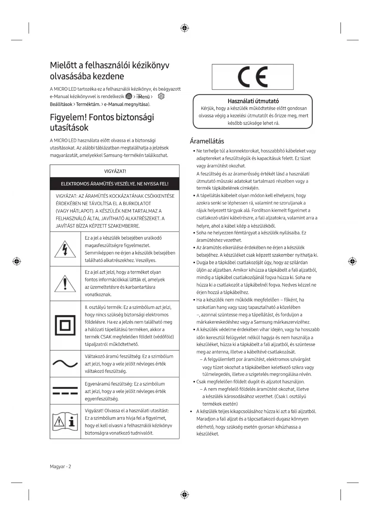 2022-11-04 (Allekirjoituspaikka ja päivämäärä) Stephen Colclough – Sääntelyasioiden johtaja (Valtuutetun henkilön nimi ja allekirjoitus) ※ Tämä ei ole Samsung-huollon numero. Samsung-huollon osoite ja puhelinnumero ilmoitetaan takuukortissa. Voit myös ottaa yhteyden jälleenmyyjään, jolta hankit tuotteen. Suomi - 11 SuomiMielőtt a felhasználói kézikönyv olvasásába kezdene A MICRO LED tartozéka ez a felhasználói kézikönyv, és beágyazott e-Manual kézikönyvvel is rendelkezik ( > Menü > Beállítások > Terméktám. > e-Manual megnyitása). Figyelem! Fontos biztonsági utasítások A MICRO LED használata előtt olvassa el a biztonsági utasításokat. Az alábbi táblázatban megtalálhatja a jelzések magyarázatát, amelyekkel Samsung-termékén találkozhat. VIGYÁZAT! ELEKTROMOS ÁRAMÜTÉS VESZÉLYE. NE NYISSA FEL! VIGYÁZAT: AZ ÁRAMÜTÉS KOCKÁZATÁNAK CSÖKKENTÉSE ÉRDEKÉBEN NE TÁVOLÍTSA EL A BURKOLATOT (VAGY HÁTLAPOT). A KÉSZÜLÉK NEM TARTALMAZ A FELHASZNÁLÓ ÁLTAL JAVÍTHATÓ ALKATRÉSZEKET. A JAVÍTÁST BÍZZA KÉPZETT SZAKEMBERRE. Ez a jel a készülék belsejében uralkodó magasfeszültségre figyelmeztet. Semmiképpen ne érjen a készülék belsejében található alkatrészekhez. Veszélyes. Ez a jel azt jelzi, hogy a terméket olyan fontos információkkal látták el, amelyek az üzemeltetésre és karbantartásra vonatkoznak.
