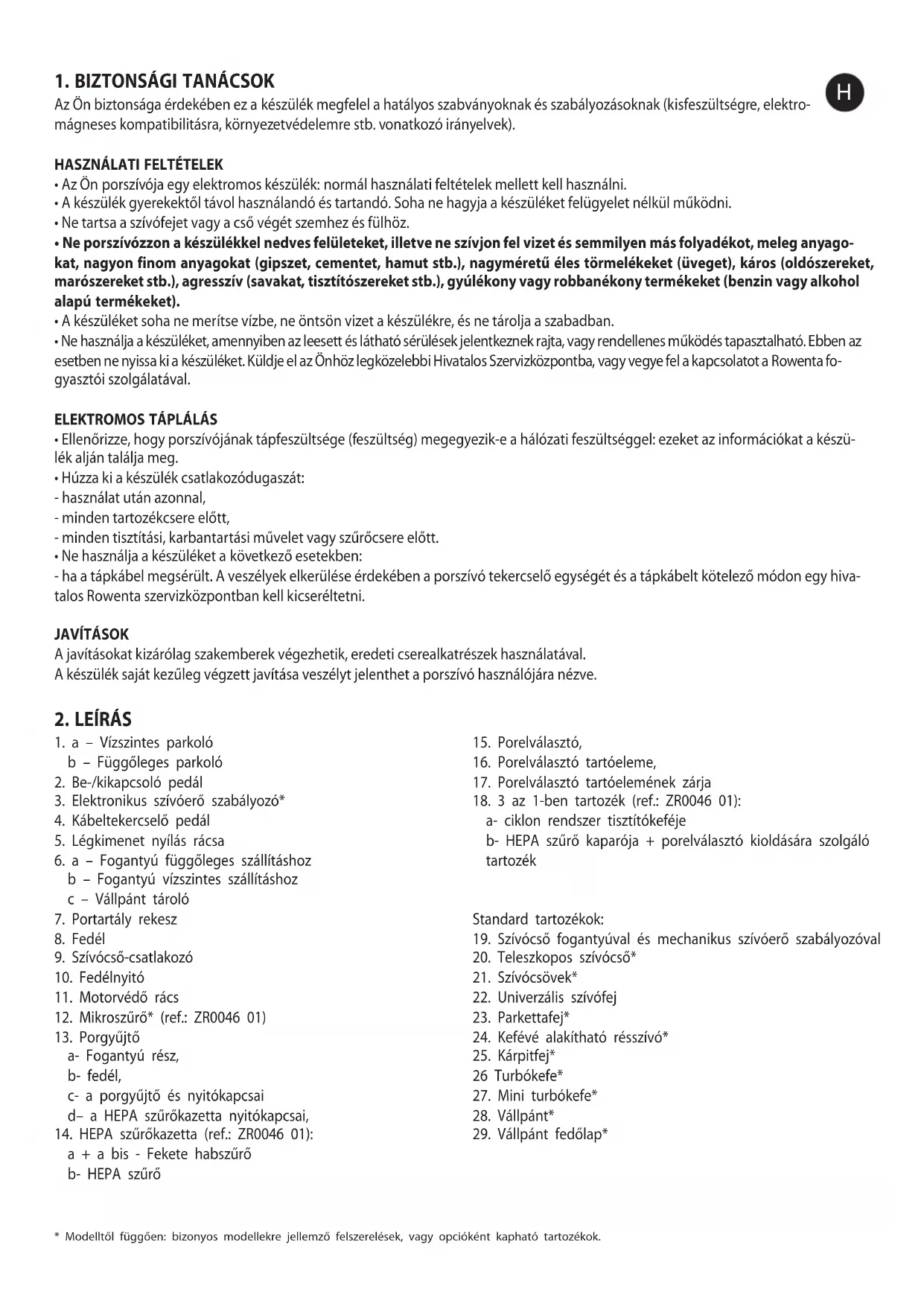 - A tápkábel lelassult a behúzás során: húzza ki a kábelt, és nyomja meg a kábelcsévélő pedált (4). HAPORSZÍVÁS KÖZBEN APORSZÍVÓLEÁLL A hővédelem működésbe lépett. Ellenőrizze, hogy a cső és a flexibilis cső nincsenek-e eltömődve, vagy a zsák és a szűrők nem teltek-e meg. A porszívó újbóli bekapcsolása előtt hagyja hűlni 30 percig. Amennyiben a probléma nem szűnik meg, juttassa el porszívóját a legközelebbu hi- vatalos Rowenta szervizközpontba.Tekintse meg a hivatalos Rowenta szervizközpontok listáját, vagy vegye fel a kapcsolatot a Rowenta ügy- fészolgálattal. GARANCIA Ez a készülék kizárólag háztartásbeli, otthoni használatra alkalmas. Nem megfelelő, vagy a használati útmutató utasításait be nem tartó hasz- nálat esetén a gyártó cég semmilyen felelősséget nem vállal, a garancia pedig érvényét veszti. A készülék első használata előtt figyelmesen olvassa el a használati útmutatót. A használati utasításban leírtaktól eltérő használat minden- nemű felelősség alól mentesíti a Rowenta céget.