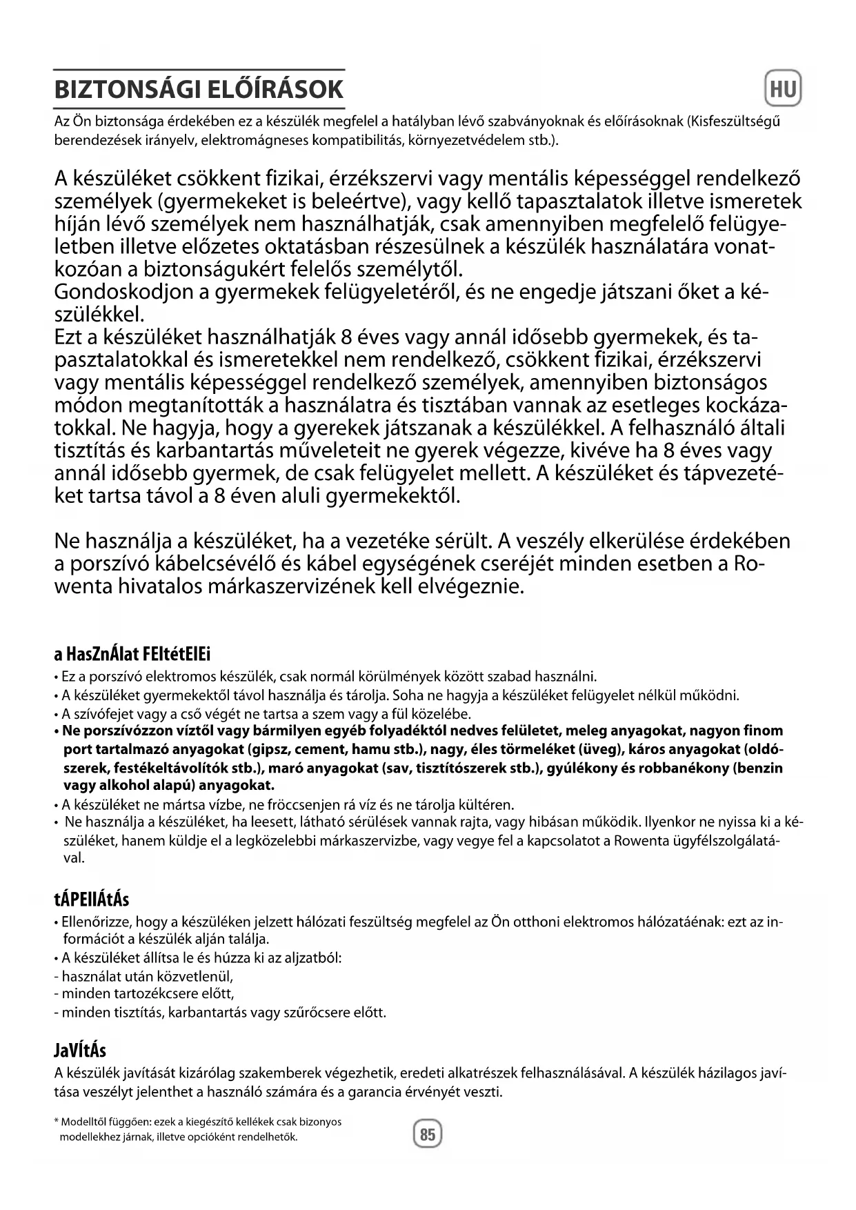 Az Ön biztonsága érdekében ez a készülék megfelel a hatályban lévő szabványoknak és előírásoknak (Kisfeszültségű berendezések irányelv, elektromágneses kompatibilitás, környezetvédelem stb.). A készüléket csökkent fizikai, érzékszervi vagy mentális képességgel rendelkező személyek (gyermekeket is beleértve), vagy kellő tapasztalatok illetve ismeretek híján lévő személyek nem használhatják, csak amennyiben megfelelő felügye- letben illetve előzetes oktatásban részesülnek a készülék használatára vonat- kozóan a biztonságukért felelős személytől. Gondoskodjon a gyermekek felügyeletéről, és ne engedje játszani őket a ké- szülékkel. Ezt a készüléket használhatják 8 éves vagy annál idősebb gyermekek, és ta- pasztalatokkal és ismeretekkel nem rendelkező, csökkent fizikai, érzékszervi vagy mentális képességgel rendelkező személyek, amennyiben biztonságos módon megtanították a használatra és tisztában vannak az esetleges kockáza- tokkal. Ne hagyja, hogy a gyerekek játszanak a készülékkel. A felhasználó általi tisztítás és karbantartás műveleteit ne gyerek végezze, kivéve ha 8 éves vagy annál idősebb gyermek, de csak felügyelet mellett. A készüléket és tápvezeté- ket tartsa távol a 8 éven aluli gyermekektől. Ne használja a készüléket, ha a vezetéke sérült. A veszély elkerülése érdekében a porszívó kábelcsévélő és kábel egységének cseréjét minden esetben a Ro- wenta hivatalos márkaszervizének kell elvégeznie. a HasZnÁlat FEltétElEi
