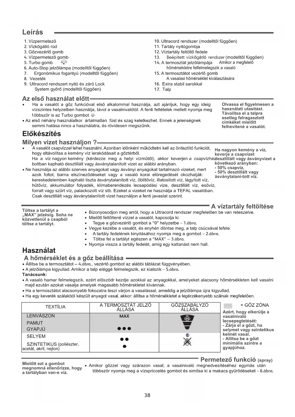 égett. Természetes dolog, hogy amikor az auto-stop-os biztonság működik a termosztát jelzőlámpája nem világit. Figyelem ! - Soha ne érintse meg a rúd végét ! - A vasaló a vizkőgátló rúd nélkül nem működik. Az első felhasználáskor, várjon 2 percet, ahhoz, hogy gőz fejlődhessen. Soha ne használjon súrolószert vagy agresszív termékeket. A vízkövesedés késleltetése és egy hosszú élettartam elérése érdekében havonta végezze el az öntisztítást.