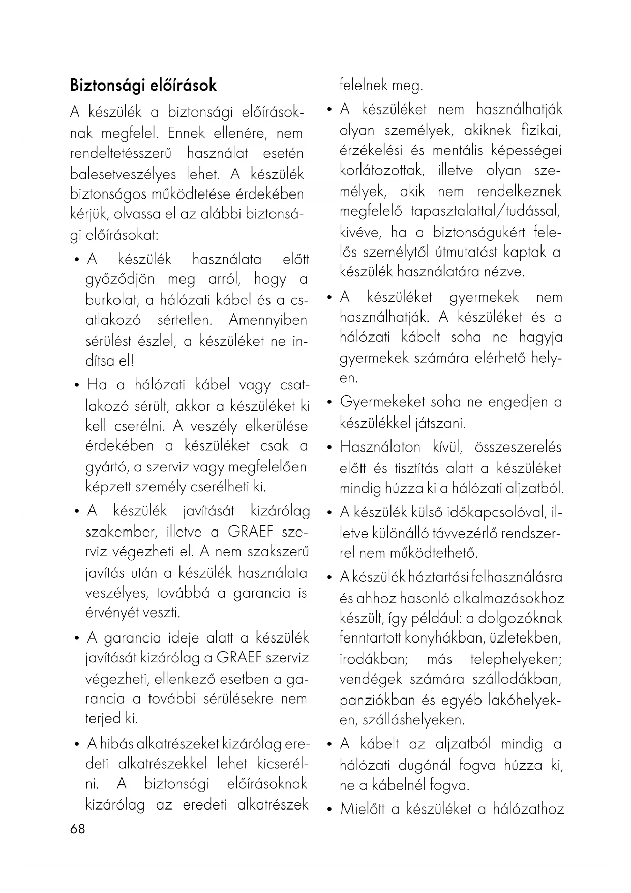 - A készülék javítását kizárólag szakember, illetve a GRAEF sze- rviz végezheti el. A nem szakszerű javítás után a készülék használata veszélyes, továbbá a garancia is érvényét veszti.