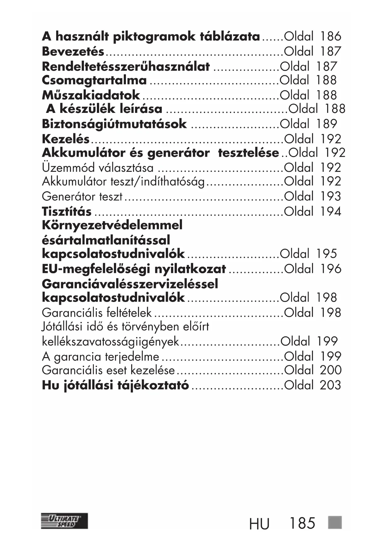 A használt piktogramok táblázata ......Oldal 186 Bevezetés ................................................Oldal 187 Rendeltetésszerű használat ..................Oldal 187 Csomag tartalma ...................................Oldal 188 Műszaki adatok .....................................Oldal 188 A készülék leírása .................................Oldal 188 Biztonsági útmutatások ........................Oldal 189 Kezelés ....................................................Oldal 192 Akkumulátor és generátor tesztelése ..Oldal 192 Üzemmód választása ..................................Oldal 192 Akkumulátor teszt/indíthatóság .....................Oldal 192 Generátor teszt ...........................................Oldal 193 Tisztítás ...................................................Oldal 194 Környezetvédelemmel és ártalmat lanítással kapcsolatos tudnivalók .........................Oldal 195 EU-megfelelőségi nyilatkozat ...............Oldal 196 Garanciával és szervizeléssel kapcsolatos tudnivalók .........................Oldal 198 Garanciális feltételek ...................................Oldal 198 Jótállási idő és törvényben előírt kellékszavatossági igények ...........................Oldal 199 A garancia terjedelme .................................Oldal 199 Garanciális eset kezelése .............................Oldal 200 Hu jótállási tájékoztató .........................Oldal 203186