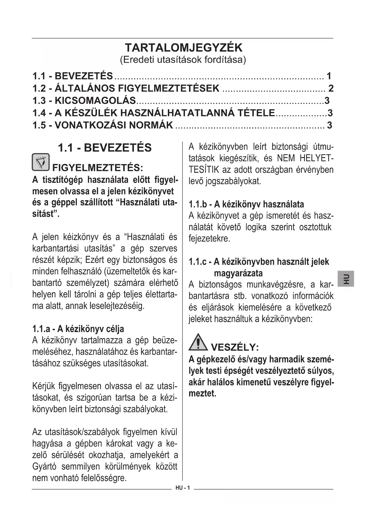FIGYELMEZTETÉS: A tisztítógép használata előtt figyel- mesen olvassa el a jelen kézikönyvet és a géppel szállított “Használati uta- sítást”. A jelen kéizkönyv és a “Használati és karbantartási utasítás” a gép szerves részét képzik; Ezért egy biztonságos és minden felhasználó (üzemeltetők és kar- bantartó személyzet) számára elérhető helyen kell tárolni a gép teljes élettarta- ma alatt, annak leselejtezéséig.
