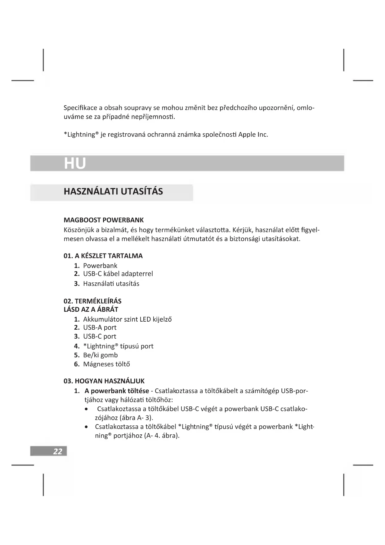 - Csatlakoztassa a töltőkábel *Lightning® pusú végét a powerbank *Light- ning® portjához (A- 4. ábra). Specikace a obsah soupravy se mohou změnit bez předchozího upozornění, omlo- uváme se za případné nepříjemnos. *Lightning® je registrovaná ochranná známka společnos Apple Inc.23