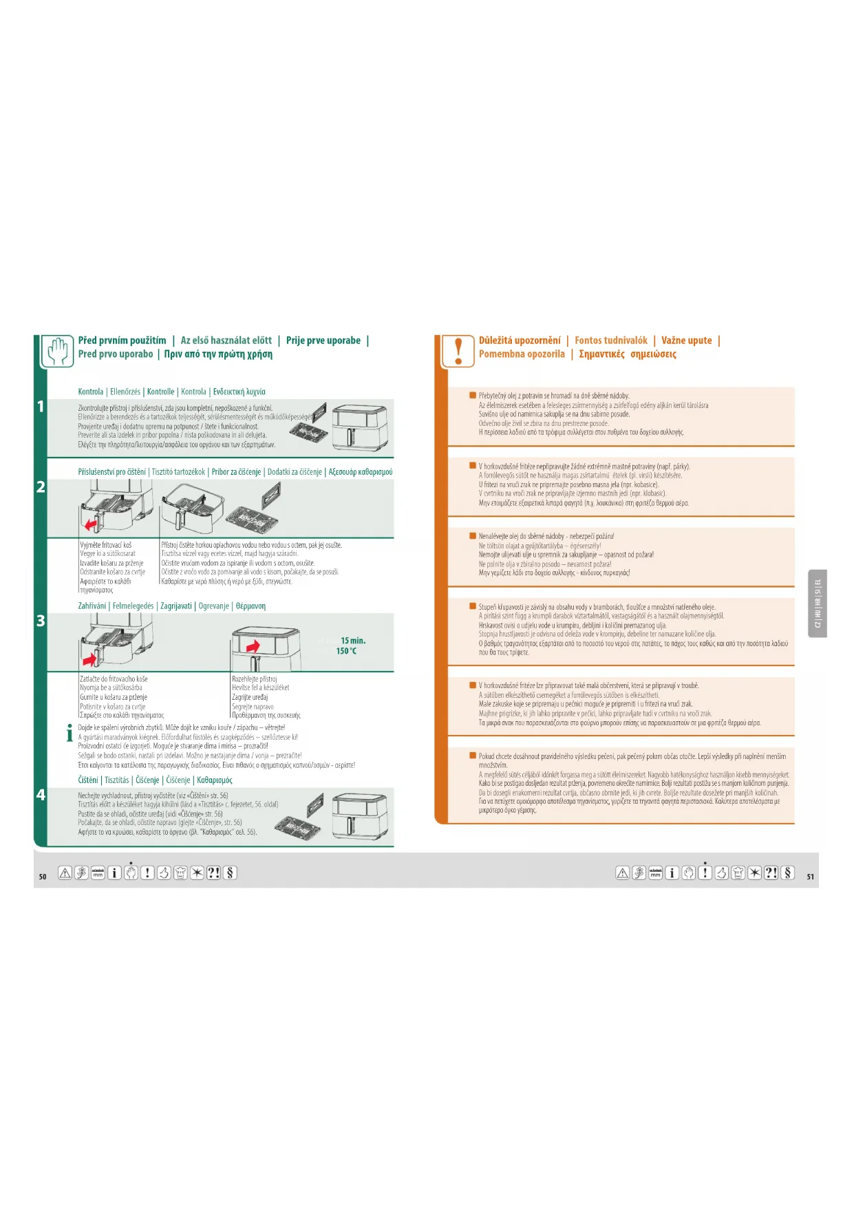 Kontrola | Ellenőrzés | Kontrolle | Kontrola | Ενδεικτική λυχνία Ellenőrizze a berendezés és a tartozékok teljességét, sérülésmentességét és működőképességét. Provjerite uređaj i dodatnu opremu na potpunost / štete i funkcionalnost. Preverite ali sta izdelek in pribor popolna / nista poškodovana in ali delujeta. Zkontrolujte přístroj i příslušenství, zda jsou kompletní, nepoškozené a funkční. Ελέγξτε την πληρότητα/λειτουργία/ασφάλεια του οργάνου και των εξαρτημάτων. Příslušenství pro čištění | Tisztító tartozékok | Pribor za čišćenje | Dodatki za čiščenje | Αξεσουάρ καθαρισμού Vyjměte fritovací koš Vegye ki a sütőkosarat Izvadite košaru za prženje Odstranite košaro za cvrtje Αφαιρέστε το καλάθι τηγανίσματος Přístroj čistěte horkou oplachovou vodou nebo vodou s octem, pak jej osušte. Tisztítsa vízzel vagy ecetes vízzel, majd hagyja száradni. Očistite vrućom vodom za ispiranje ili vodom s octom, osušite. Καθαρίστε με νερό πλύσης ή νερό με ξύδι, στεγνώστε. Očistite z vročo vodo za pomivanje ali vodo s kisom, počakajte, da se posuši. Zahřívání | Felmelegedés | Zagrijavati | Ogrevanje | Θέρμανση Zatlačte do fritovacího koše Nyomja be a sütőkosárba Gurnite u košaru za prženje Potisnite v košaro za cvrtje Σπρώξτε στο καλάθι τηγανίσματος Rozehřejte přístroj Hevítse fel a készüléket Zagrijte uređaj Segrejte napravo Προθέρμανση της συσκευής Dojde ke spálení výrobních zbytků. Může dojít ke vzniku kouře / zápachu – větrejte! A gyártási maradványok kiégnek. Előfordulhat füstölés és szagképződés – szellőztesse ki! Proizvodni ostatci će izgorjeti. Moguće je stvaranje dima i mirisa – prozračiti! Έτσι καίγονται τα κατάλοιπα της παραγωγικής διαδικασίας. Είναι πιθανός ο σχηματισμός καπνού/οσμών - αερίστε! Sežgali se bodo ostanki, nastali pri izdelavi. Možno je nastajanje dima / vonja – prezračite! Čištění | Tisztítás | Čišćenje | Čiščenje | Καθαρισμός Tisztítás előtt a készüléket hagyja kihűlni (lásd a «Tisztítás» c. fejezetet, 56. oldal) Pustite da se ohladi, očistite uređaj (vidi «Čišćenje» str. 56) Počakajte, da se ohladi, očistite napravo (glejte «Čiščenje», str. 56) Nechejte vychladnout, přístroj vyčistěte (viz «Čištění» str. 56) Αφήστε το να κρυώσει, καθαρίστε το όργανο (βλ. "Καθαρισμός" σελ. 56).5352 CZ | HU | HR | SI | EL Nechte fritovací koš řádně vychladnout Hagyja a sütőkosarat megfelelően kihűlni. Ostavite košaru za prženje da se dobro ohladi Αφήστε το καλάθι τηγανίσματος να κρυώσει καλά Pustite košaro za cvrtje, da se ustrezno ohladi.