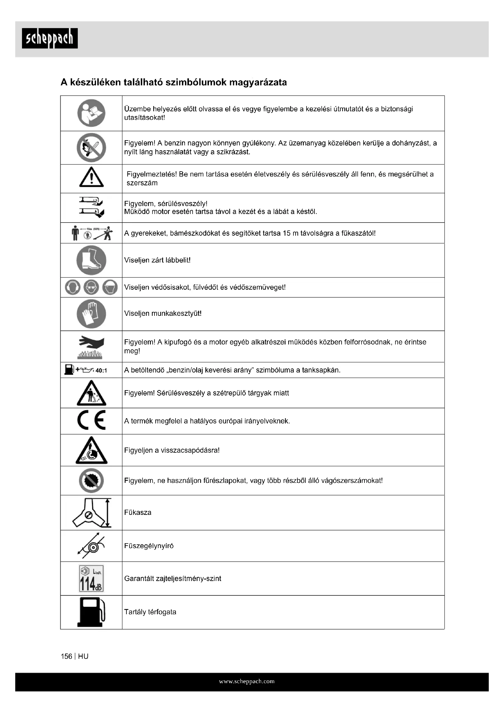 A készüléken található szimbólumok magyarázata Üzembe helyezés előtt olvassa el és vegye gyelembe a kezelési útmutatót és a biztonsági utasításokat! Figyelem! A benzin nagyon könnyen gyúlékony. Az üzemanyag közelében kerülje a dohányzást, a nyílt láng használatát vagy a szikrázást. Figyelmeztetés! Be nem tartása esetén életveszély és sérülésveszély áll fenn, és megsérülhet a szerszám Figyelem, sérülésveszély! Működő motor esetén tartsa távol a kezét és a lábát a késtől. A gyerekeket, bámészkodókat és segítőket tartsa 15 m távolságra a fűkaszától! Viseljen zárt lábbelit! Viseljen védősisakot, fülvédőt és védőszemüveget! Viseljen munkakesztyűt! Figyelem! A kipufogó és a motor egyéb alkatrészei működés közben felforrósodnak, ne érintse meg! 40:1 A betöltendő „benzin/olaj keverési arány” szimbóluma a tanksapkán. Figyelem! Sérülésveszély a szétrepülő tárgyak miatt A termék megfelel a hatályos európai irányelveknek. Figyeljen a visszacsapódásra! Figyelem, ne használjon fűrészlapokat, vagy több részből álló vágószerszámokat! Fűkasza Fűszegélynyíró Garantált zajteljesítmény-szint Tartály térfogatawww.scheppach.com